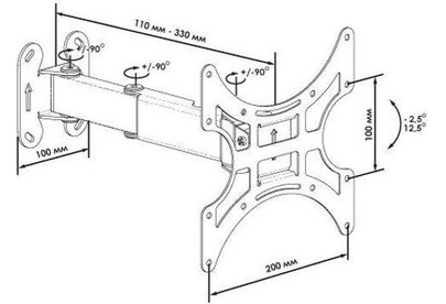 Тип: наклонно - поворотный, с вращением и частичным складыванием ugol -2,5°/ 12,5° povorot+/-90° Диагональ: 17" -32" (43 см – 81 см) Стандарт VESA: 100*100, 100*200, 200*200 Нагрузка: до 25 кг. Цвет серый.