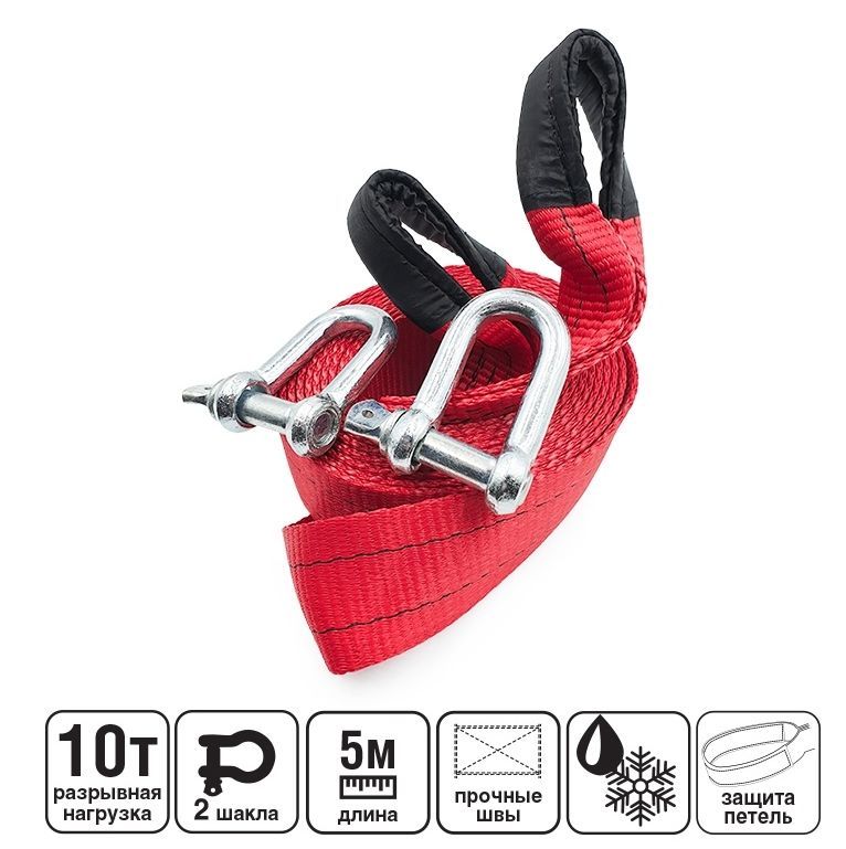Трос буксировочный предназначен для буксировки автомобилей и других транспортных средств. Максимальная масса буксируемого автомобиля: 10 т Длина: 5 м (в соответствии с п. 20.3 ПДД) Изготовлен из высокопрочного полиэстера Отличается износостойкостью, морозоустойчивостью и стойкостью к агрессивным средам На протяжении всего срока службы не меняет свои линейные размеры ПРАВИЛА ЭКСПЛУАТАЦИИ: Движение во время буксировки должно быть плавным, без резких рывков и торможений. Не является рывковым тросом! Следить, чтобы провисший трос не намотался на колеса. Не применять для подъёма. Максимальная масса авто: 10 т Комплектация: Скоба такелажная М16 – 2 шт.; Трос буксировочный Длина: 5 м Состав: Скоба такелажная М18: сталь. Материал ленты: полиэстер.