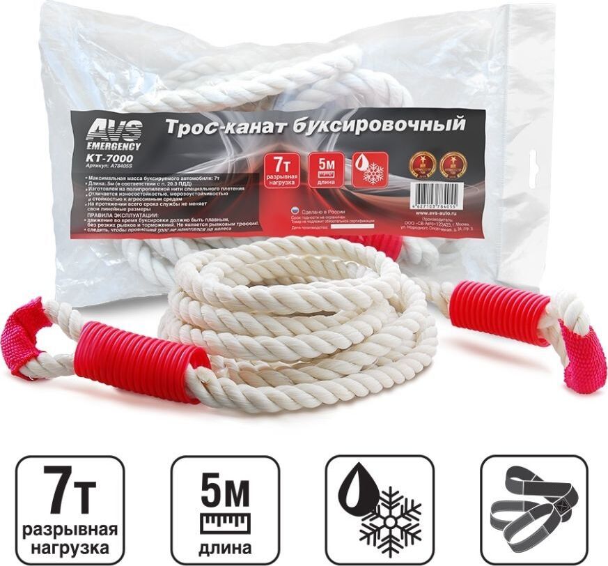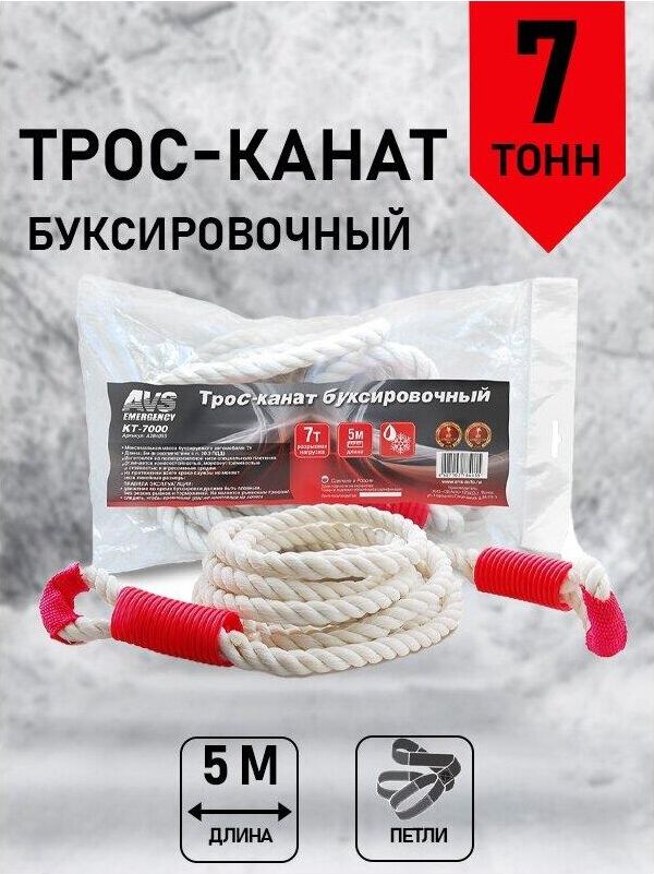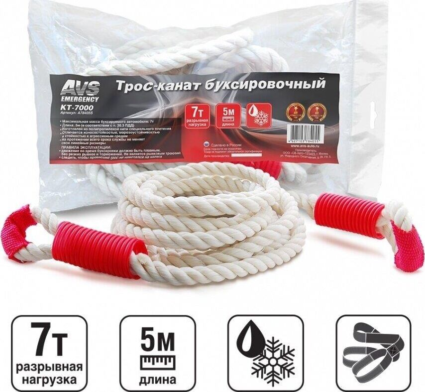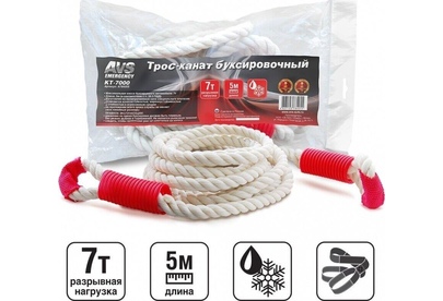 Трос буксировочный AVS KT-7000 канат без крюков 7т 5м, в пакете