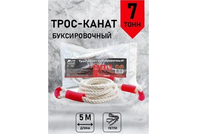 Трос-канат буксировочный с петлями предназначен для буксировки автомобилей и других транспортных средств. Разрывная нагрузка: 7т. Длина: 5м. Материал: полипропилен Свойства материала: высокопрочный, износостойкий, морозоустойчивый. стойкий к агрессивным средам на протяжении всего срока службы не меняет свои линейные размеры Комплектация: трос.