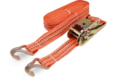 Выдерживают нагрузку на прямое стяжное усилие – 400 кг и стяжное усилие при обхвате – 800 кг. Характеристики • Упрощенный храповый стяжной механизм из стали с ручкой в форме пластины. • Высокопрочная лента из полипропилена 25 мм. Имеет прочные швы. Отличается морозостойкостью и устойчивостью к агрессивным средам. Длина ленты в модели 5 метра. • J – образные стальные крюки.