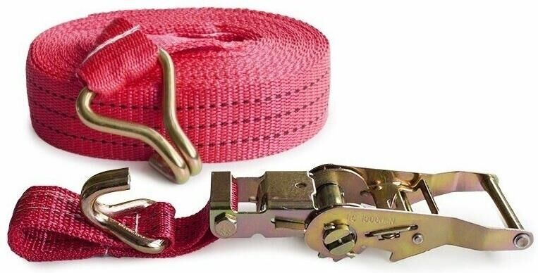 Выдерживает нагрузку на прямое стяжное усилие – 2 тонну и стяжное усилие при обхвате – 4 тонны. Характеристики • Храповый стяжной механизм из стали с ручкой типа «Эконом» (ручка полностью стальная, не имеет вставок). • Высокопрочная лента из полипропилена 50 мм. Имеет прочные швы. Отличается морозостойкостью и устойчивостью к агрессивным средам. Длина ленты составляет 6 метров. • J – образные стальные крюки.