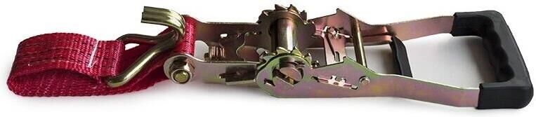 Выдерживают нагрузку на прямое стяжное усилие – 2,5 тонн и стяжное усилие при обхвате – 5 тонн. Характеристики • Храповый стяжной механизм длиной 230мм из высококачественной стали с анатомической ручкой облитой пластиком. • Высокопрочная лента из полипропилена 50 мм. Имеет прочные швы. Отличается морозостойкостью и устойчивостью к агрессивным средам. Длина ленты составляет 6 метров. • J – образные стальные крюки.