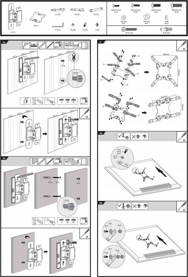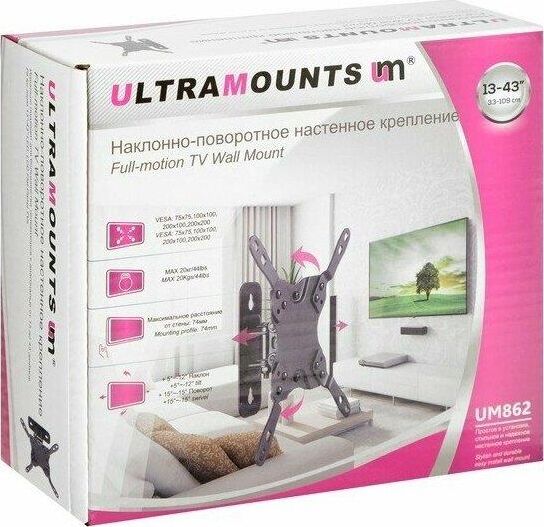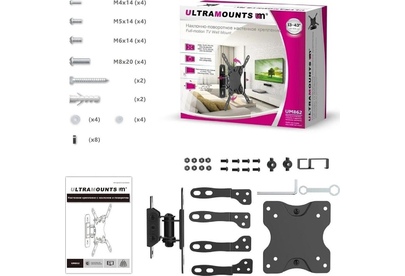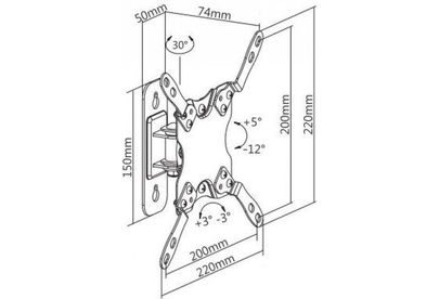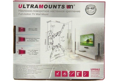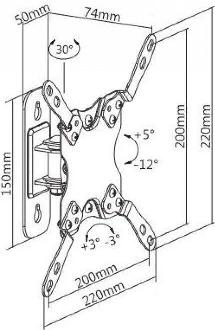 Для использования с телевизорами диагональю 13"-42", весом до 25кг. Возможен наклон до 12 градусов и подъем до 5 градусов Поворот влево и вправо на 15 градусов . Расстояние телевизора от стены 74мм. VESA 75x75, 100x100, 200x200