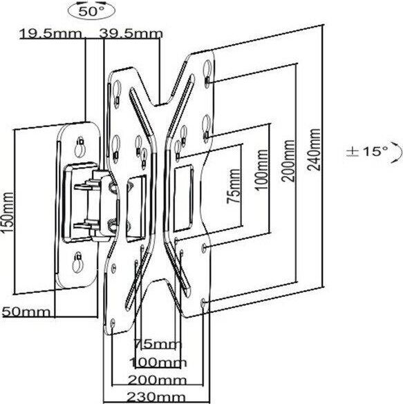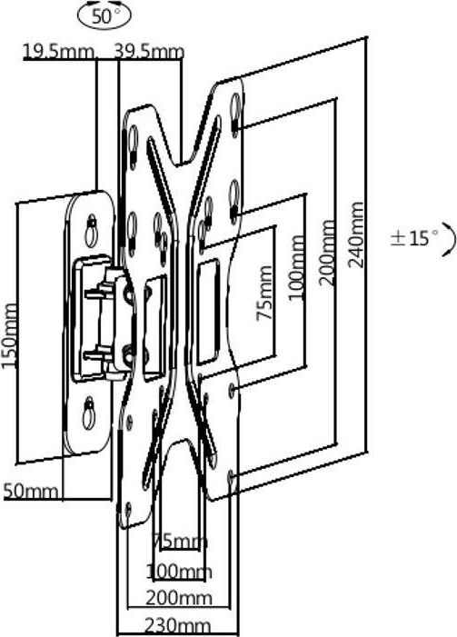 Для использования с телевизорами диагональю 23"-42", весом до 30кг. Возможен наклон до 12 градусов и подъем до 5 градусов Поворот влево и вправо на 25 градусов. Расстояние телевизора от стены 59мм. VESA 75x75, 100x100, 200x200.
