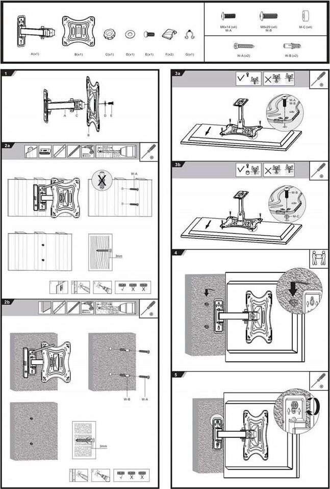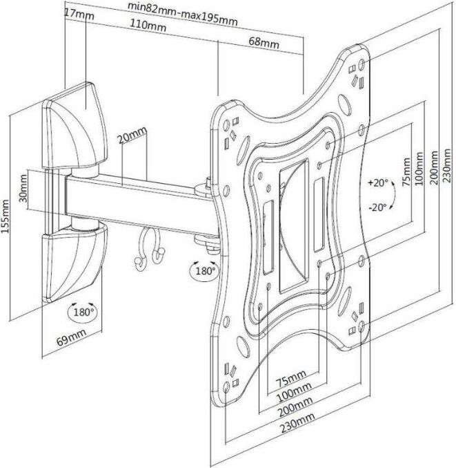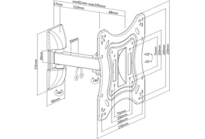 Для использования с телевизорами диагональю 23"-42", весом до 20кг. Возможен наклон до 20 градусов и подъем до 20 градусов Поворот влево и вправо на 90 градусов . Расстояние телевизора от стены 82-195мм. VESA 75x75, 100x100, 200x200