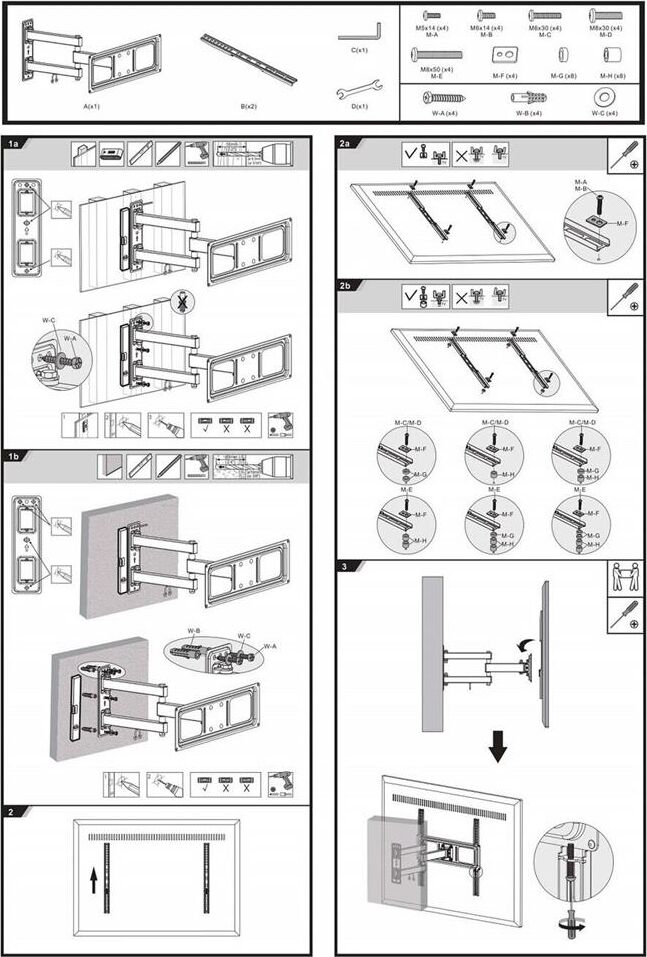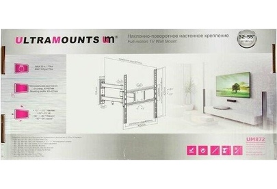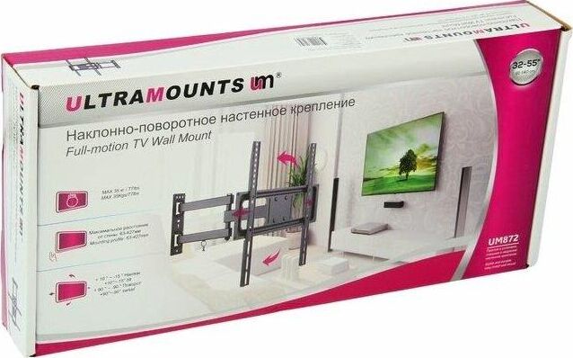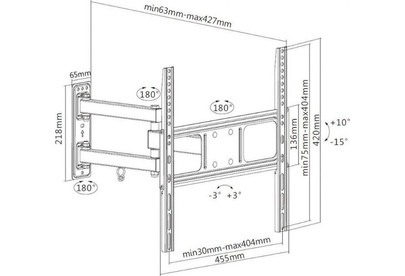 Для использования с телевизорами диагональю 32"-55", весом до 45кг. Возможен наклон до 15 градусов и подъем до 10 градусов Поворот влево и вправо на 90 градусов. Расстояние телевизора от стены 63-427мм. VESA 200x200, 300x300,400x400.