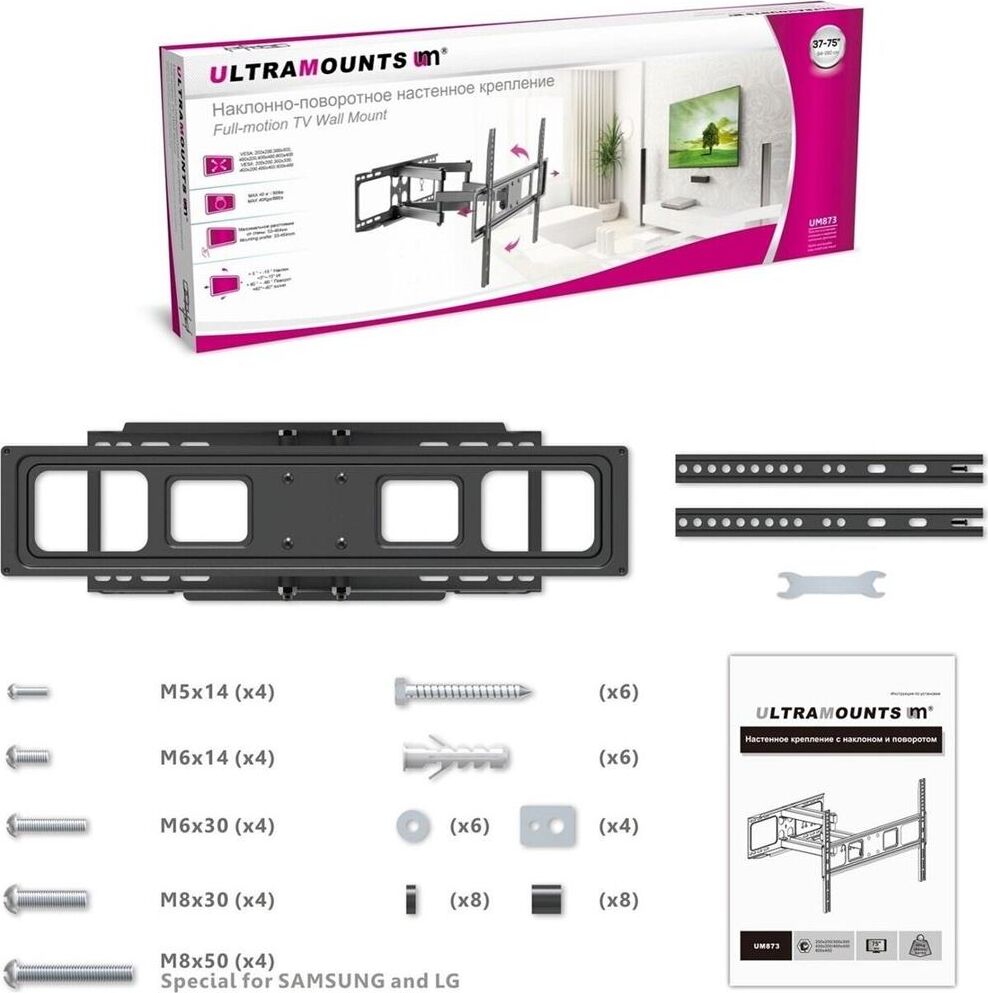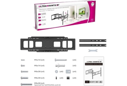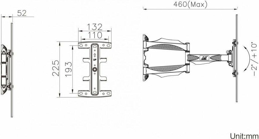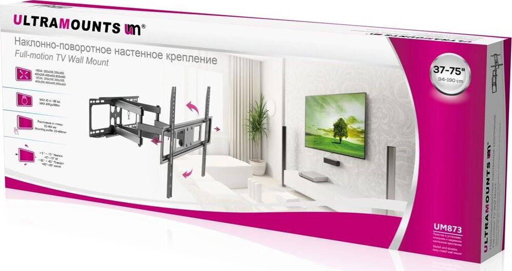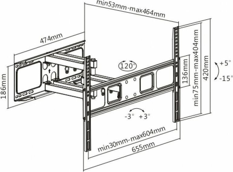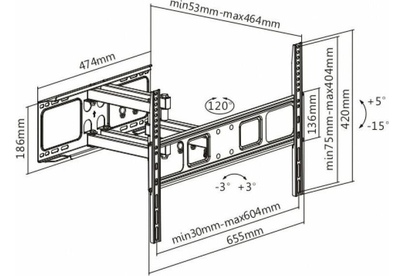 Для использования с телевизорами диагональю 37"-70", весом до 50кг. Возможен наклон до 15 градусов и подъем до 5 градусов Поворот влево и вправо на 60 градусов. Расстояние телевизора от стены 53-464мм. VESA 200x200, 300x300,400x400, 600x400