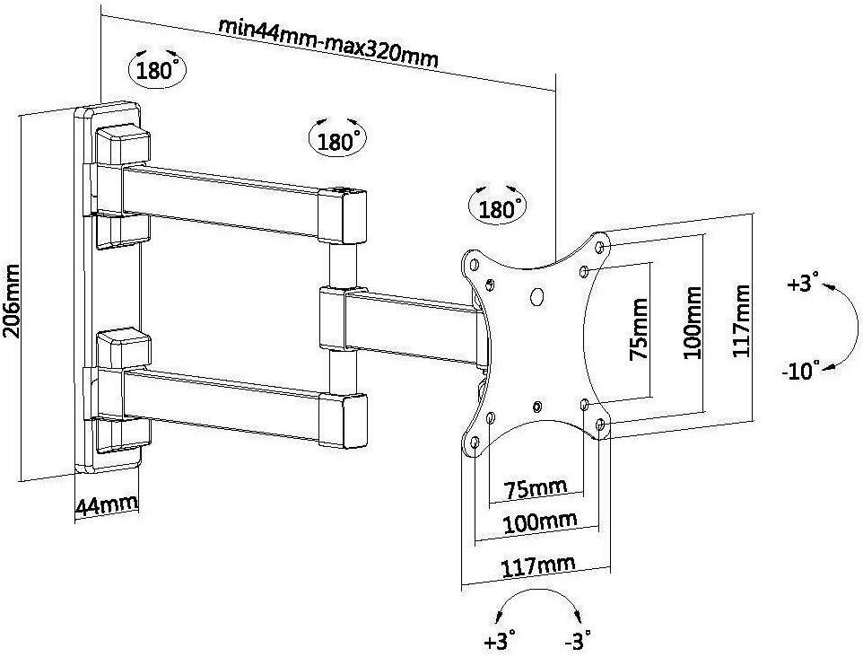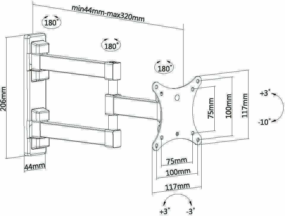 Наклонно-поворотный кронштейн со свободным наклоном и встроенной регулировкой уровня. Для использования с телевизорами 13"-27" весом до 30кг. Расстояние телевизора от стены 44-320мм. VESA 75x75,100x100. Возможен наклон до 10 градусов и подъем до 3 градусов. Поворот влево и вправо на 90 градусов . Есть регулировка экрана по часовой и против часовой стрелки на 3 градуса.