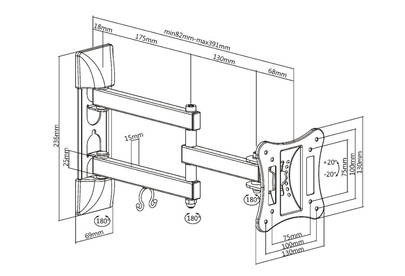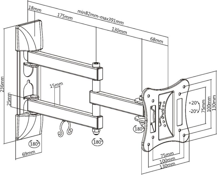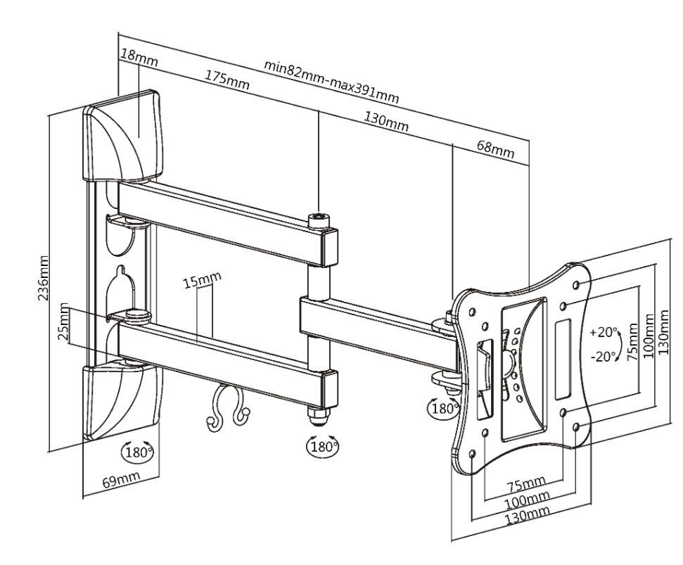 Наклонно-поворотный кронштейн со свободным наклоном. Для использования с телевизорами 13"-27" весом до 15кг. Расстояние телевизора от стены 82-391мм. VESA 75x75,100x100. Возможен наклон до 20 градусов и подъем до 20 градусов. Поворот влево и вправо на 90 градусов .