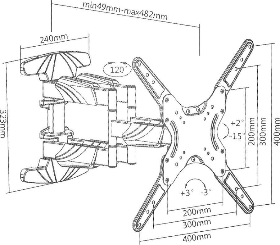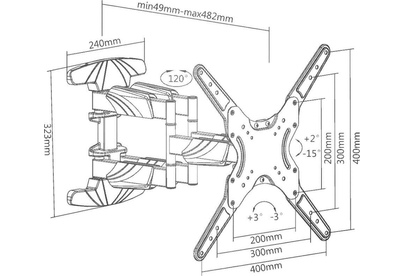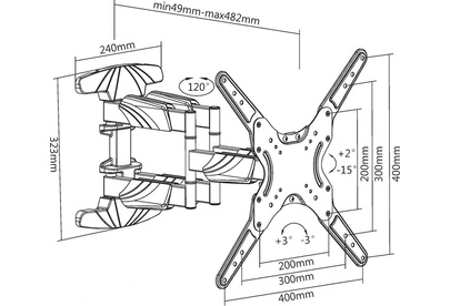 Наклонно-поворотный кронштейн со свободным наклоном. Встроенная регулировка уровня поможет найти идеальную позицию. Для использования с телевизорами 23"-55" весом до 40кг. Расстояние телевизора от стены 49-482мм. VESA 200x100,200x200,300x300,400x200,400x300,400x400. Возможен наклон до 15 градусов и подъем до 2 градусов. Поворот влево и вправо на 60 градусов . Есть регулировка экрана по часовой и против часовой стрелки на 3 градуса.