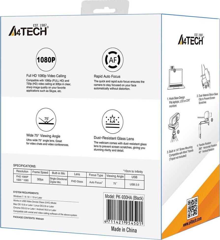 Вебкамера A4TECH Камера Web PK-930HA черный 2Mpix (1920x1080) USB2.0 с микрофоном