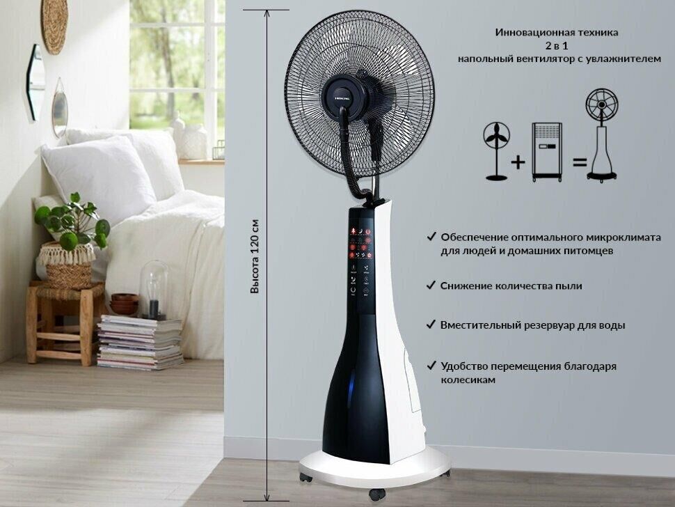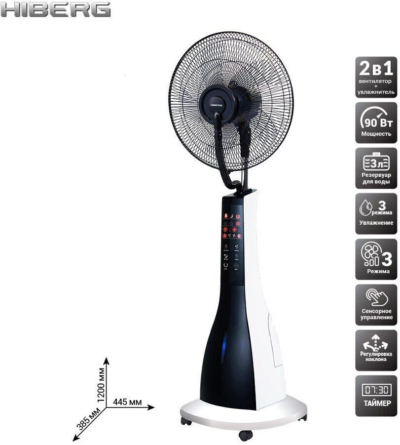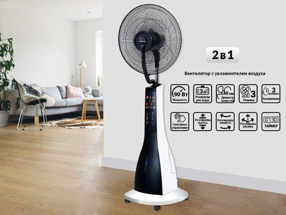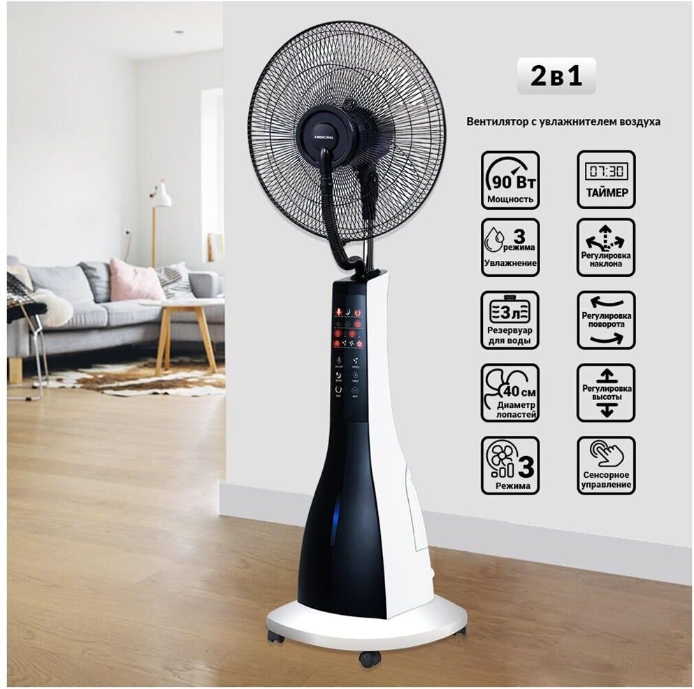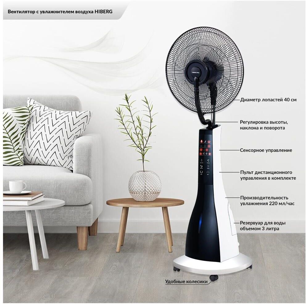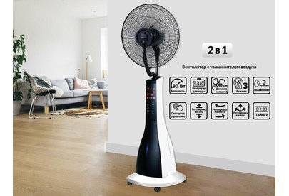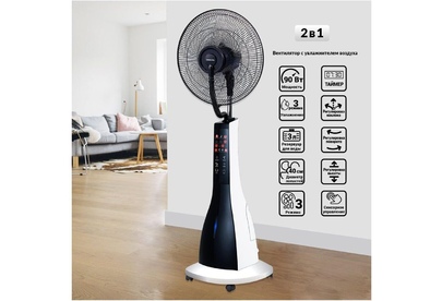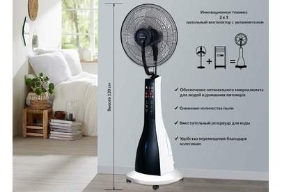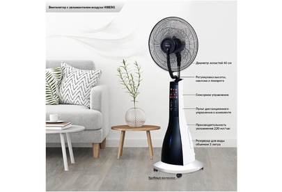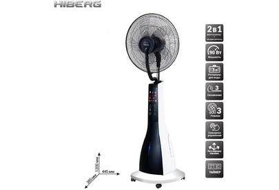Представляем вам напольный вентилятор с увлажнителем воздуха HIBERG FW 400 BW / B. Инновационное устройство с мощностью 90 Вт обеспечит не только оптимальный микроклимат для людей и питомцев, но и эффективно увлажнит воздух и снизит количество пыли в помещении. Лопасти диаметром 40 см создают достаточно сильный воздушный поток, который регулируется путем изменения угла наклона и высоты корпуса, а так же поворота в разные стороны. Тип управления вентилятором – электронный (сенсорное нажатие)