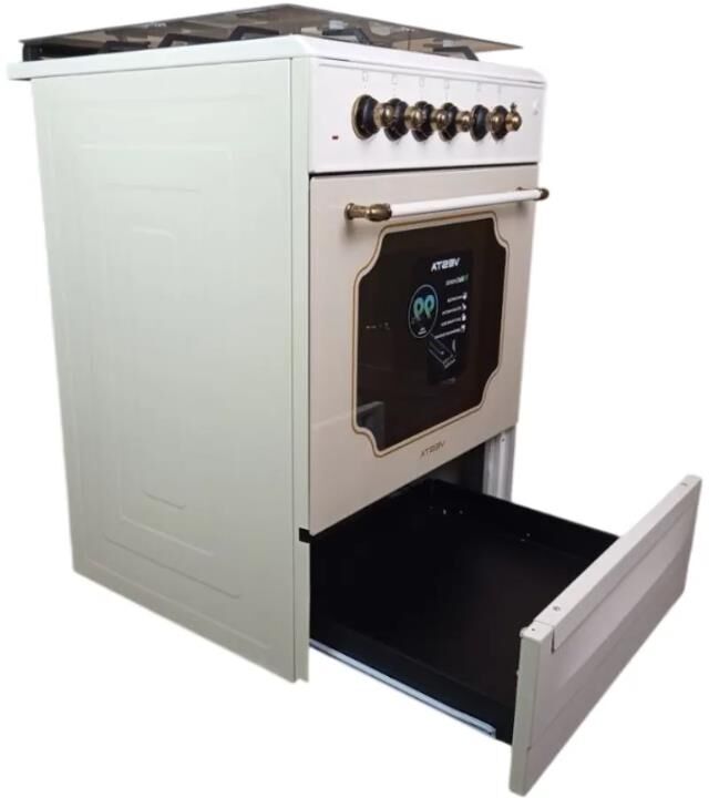 Горелки стола: Газовые – 4 шт. Выдвижной ящик для посуды. Мощность горелок рабочего стола: Горелка передняя левая/правая – 2,0/2,4 кВт. Горелка задняя левая/правая – 2,0/1,0 кВт. Электрический духовой шкаф. Объем духовки в литрах: 65 л. Верхний/нижний нагреватель духовки – тен.Решетка рабочего стола – сталь. Крышка рабочего стола – стекло. Термометр духовки. Кнопка электророзжига горелок стола. Электрическая подсветка духовки. Противень – 2 шт.Чугунные решётки. В/Ш/Г 850/600/600