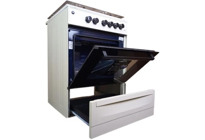 Горелки стола: Газовые – 4 шт. Выдвижной ящик для посуды. Мощность горелок рабочего стола: Горелка передняя левая/правая – 2,0/2,4 кВт. Горелка задняя левая/правая – 2,0/1,0 кВт. Электрический духовой шкаф. Объем духовки в литрах: 65 л. Верхний/нижний нагреватель духовки – тен.Решетка рабочего стола – сталь. Крышка рабочего стола – стекло. Термометр духовки. Кнопка электророзжига горелок стола. Электрическая подсветка духовки. Противень – 2 шт. В/Ш/Г 850/600/600