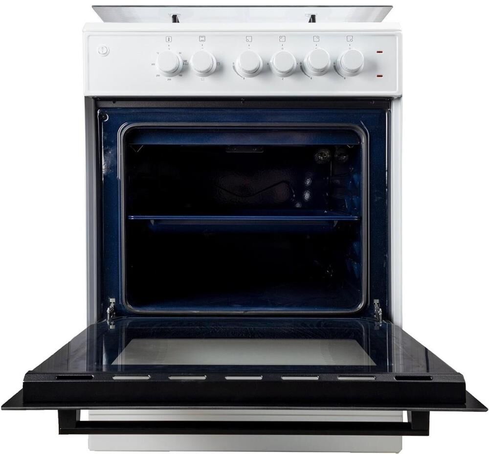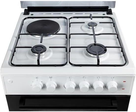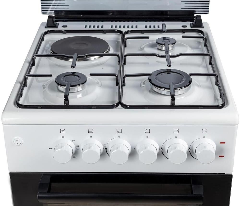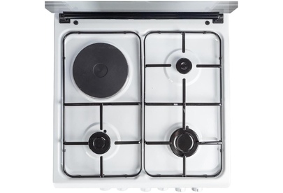 Габариты: (ШхВхГ) см - 60х85х60. Горелки стола: Газовые 3 шт. Электр. 1 шт. Мощность горелок рабочего стола: -Горелка передняя левая/правая 2,0/2,4 кВт. Горелка задняя левая, электрическая 1,5 кВт. Горелка задняя правая 1,0 кВт. Решетка рабочего стола сталь. Крышка рабочего стола стекло. Верхний нагреватель духовки ТЭН. Нижний нагреватель духовки ТЭН. Электророзжиг при помощи кнопки. Электрическая подсветка духовки. Термостат, Индикатор работы электроконфорок. Индикатор работы ТЭНа духовки. Противень 2 шт. Цвет Белый.