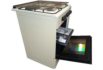 Ширина плиты, см 60, Глубина плиты, см 60, Объем духовки, л 65, Высота, см 85, Горелки стола: Газовые – 3 шт. Электр.–1 шт. Мощность горелок рабочего стола: -Горелка передняя левая/правая – 2,0/2,4 кВт. Горелка задняя левая, электрическая – 1,5 кВт. Горелка задняя правая – 1,0 кВт. Решетка рабочего стола – сталь. Крышка рабочего стола – стекло. Верхний нагреватель духовки – ТЭН. Нижний нагреватель духовки – ТЭН. Электророзжиг при помощи кнопки. Электрическая подсветка духовки. Термостат, Индикатор работы электроконфорок. Индикатор работы ТЭНа духовки. Противень – 2 шт.