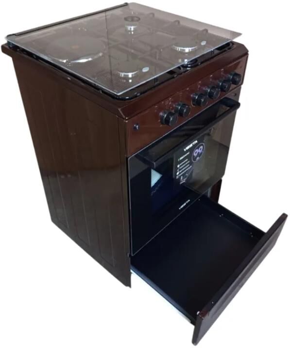 Горелки стола: Газовые – 3 шт. Электр.–1 шт. Выдвижной ящик для посуды. Мощность горелок рабочего стола: -Горелка передняя левая/правая – 2,0/2,4 кВт. Горелка задняя левая, электрическая – 1,5 кВт. Горелка задняя правая – 1,0 кВт. Решетка рабочего стола – сталь. Крышка рабочего стола – стекло. Верхний нагреватель духовки – ТЭН. Нижний нагреватель духовки – ТЭН. Электророзжиг при помощи кнопки. Электрическая подсветка духовки. Термостат, Индикатор работы электроконфорок. Индикатор работы ТЭНа духовки. Противень – 2 шт.; .В/Ш/Г 850/600/6000