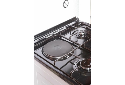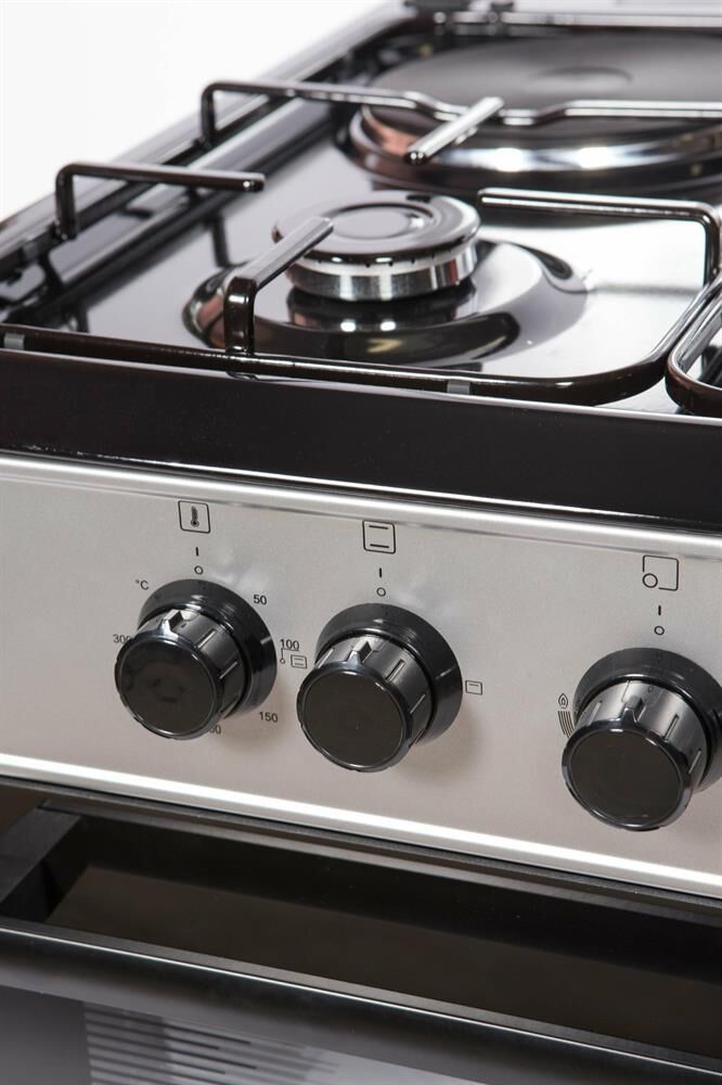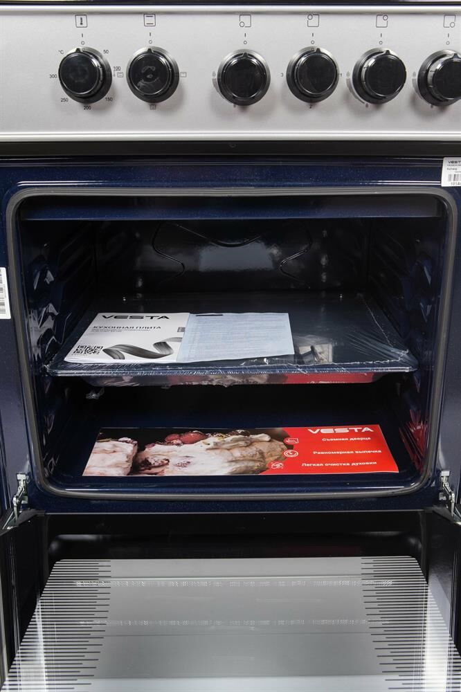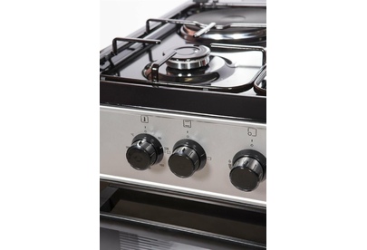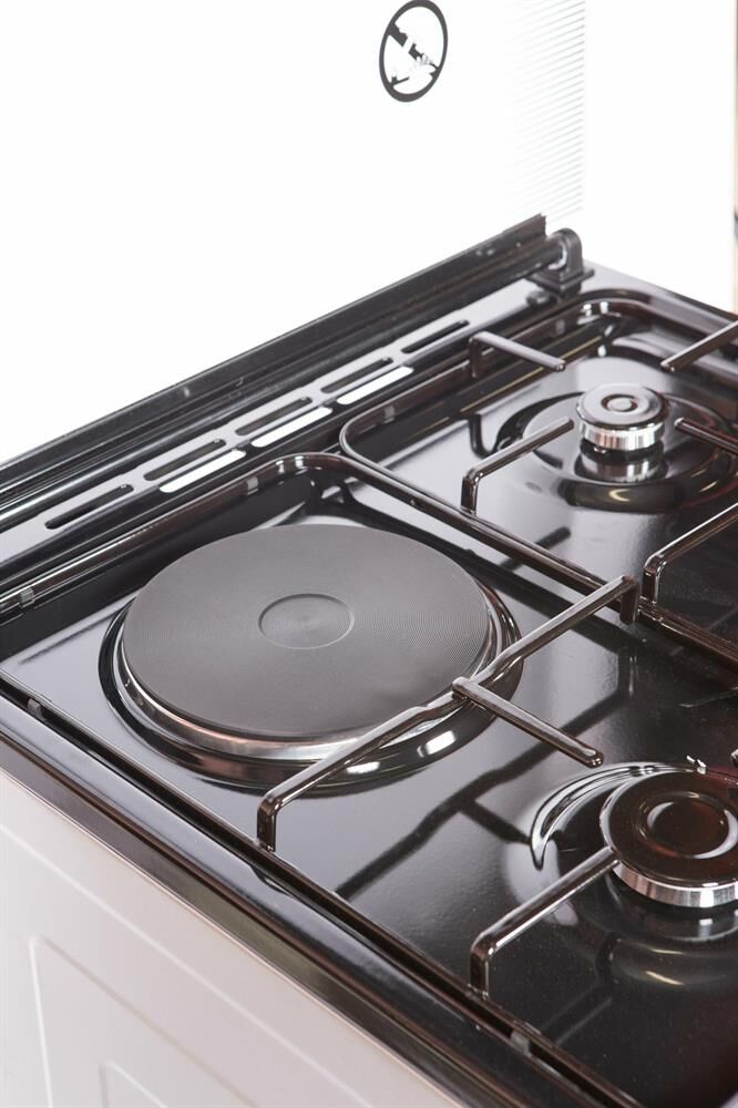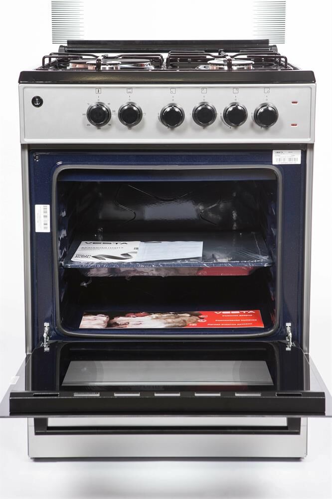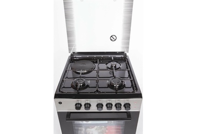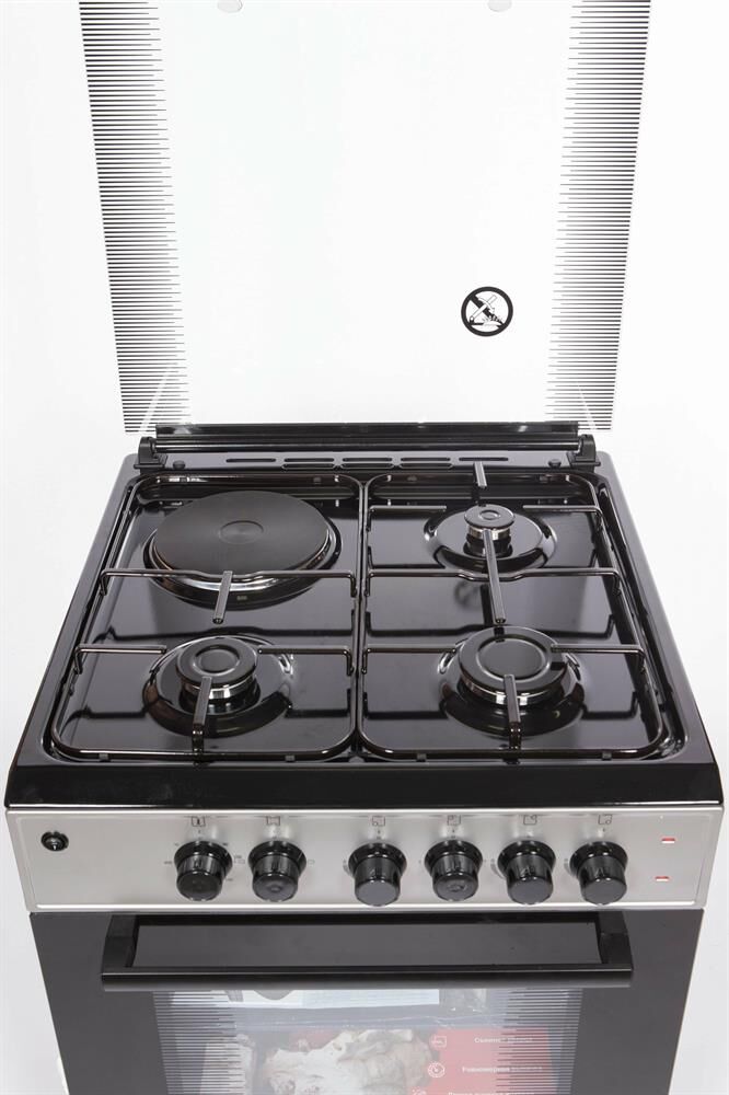 Горелки стола: Газовые – 3 шт. Электр.–1 шт. Мощность горелок рабочего стола: -Горелка передняя левая/правая – 2,0/2,4 кВт. Горелка задняя левая, электрическая – 1,5 кВт. Горелка задняя правая – 1,0 кВт. Решетка рабочего стола – сталь. Крышка рабочего стола – стекло. Верхний нагреватель духовки – ТЭН. Нижний нагреватель духовки – ТЭН. Электророзжиг при помощи кнопки. Электрическая подсветка духовки. Термостат, Индикатор работы электроконфорок. Индикатор работы ТЭНа духовки. Противень – 2 шт. Цвет Серый.