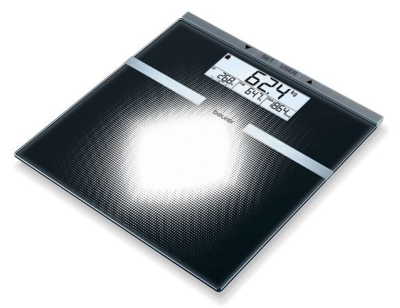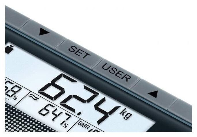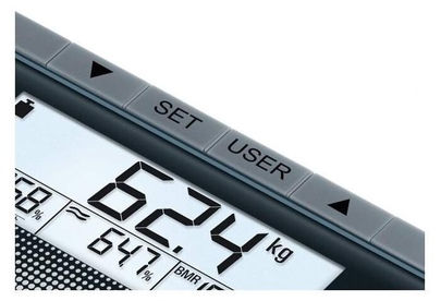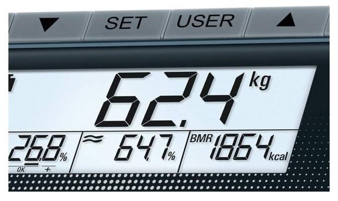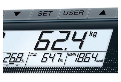 Определение веса тела, внутреннего жира, тканевой жидкости и доли мышц, массы костей, расчет расхода энергии (базовый расход/активный расход.С расчетом индекса массы тела (ИМТ). 10 ячеек памяти. Большой ЖК-дисплей: высота цифр (индикация веса): 25 мм. Максимальный вес 180 кг.