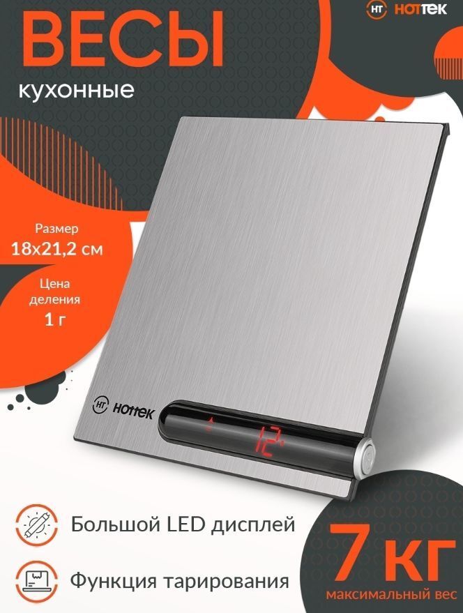 Электронные кухонные весы с платформой для взвешивания из нержавеющей стали 18х21.2 см измеряют массу овощей, мяса, рыбы, специй, пряностей и круп с точностью о 0.001 кг. На устройстве можно задать удобную для вас единицу измерения: в килограммах, граммах или фунтах. Функция тарирования позволяет при взвешивании не учитывать массу емкости, в которой лежат продукты. Максимально допустимая масса взвешивания — 7 кг. При перевесе загорится индикатор перегруза. На LED-дисплее 12х2.5 мм с подсветкой расположен индикатор разряда батареи. Кухонные весы работают от 2 батареек типа "ААА" (в комплекте).