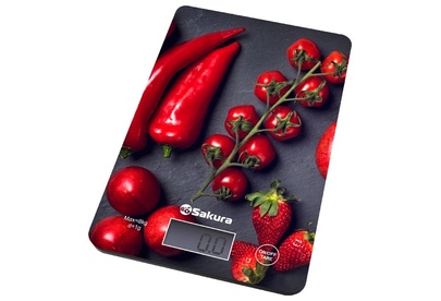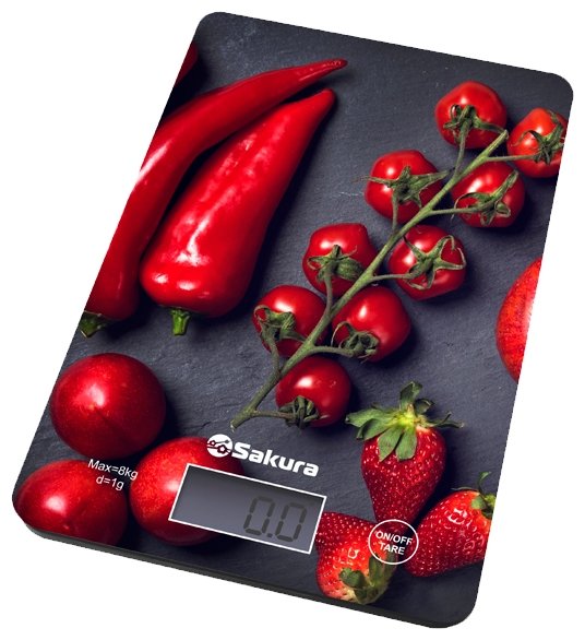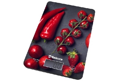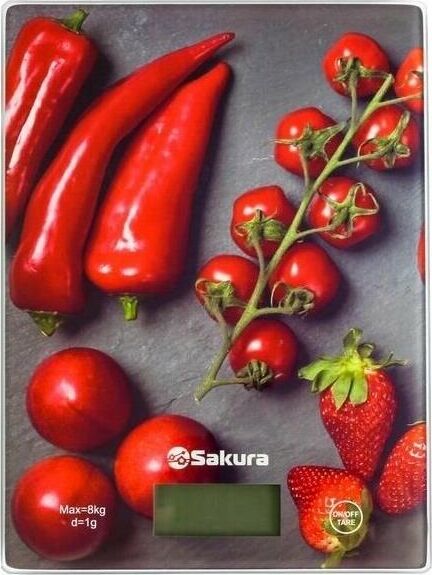Электронные, нагрузка 8 кг, цена деления 1 г, ЖК дисплей, учет веса тары, автомат.отключение, индикатор перегрузки и заряда батарейки, питание 1*CR2032 , пластиковый корпус, рабочая поверхность из прочного стекла, рисунок: перцы.