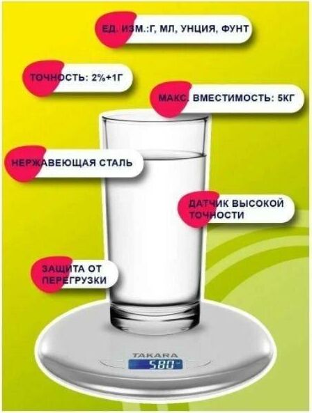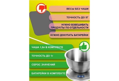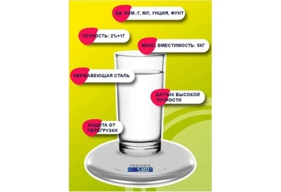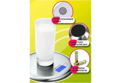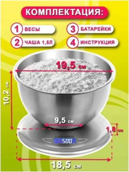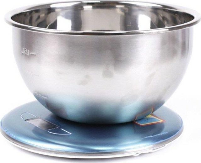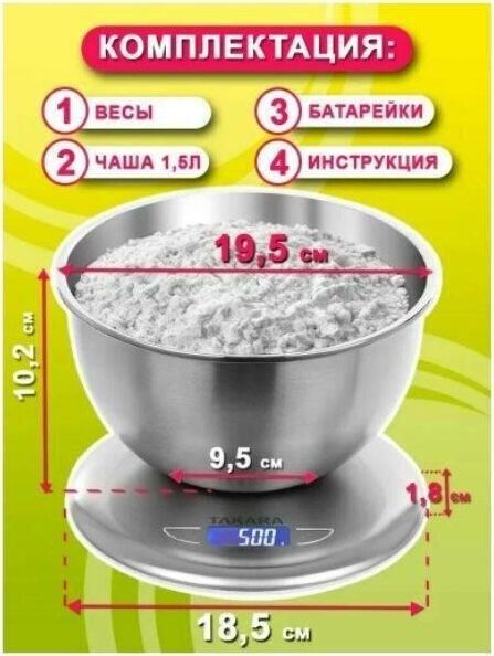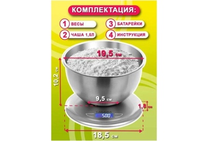 Кухонные весы с чашей для продуктов с ЖК-дисплеем обеспечивают точное взвешивание продуктов массой до 5 килограммов с точностью до 1 грамма и способны работать в различных единицах измерения (г, мл, унция, фунт). Функция «ТАРА» позволяет не учитывать массу посуды при взвешивании продуктов. 1,5-литровая чаша из нержавеющей стали со шкалой от 0,5 до 1,5 литров с шагом 0,5 л поможет более точно определить объем сыпучих и жидких объектов. На дне чаши имеется нескользящее покрытие, благодаря которому чаша не скользит и не царапает поверхность весов. Размеры: 185*185*18мм Размер ЖК-дисплея: 41*18мм Точность: 2%+1г Максимальная вместимость: 5кг Подсветка дисплея Нержавеющая сталь Датчик высокой точности Защита от перегрузки Индикатор разряда батареи Автоматическое или ручное отключение