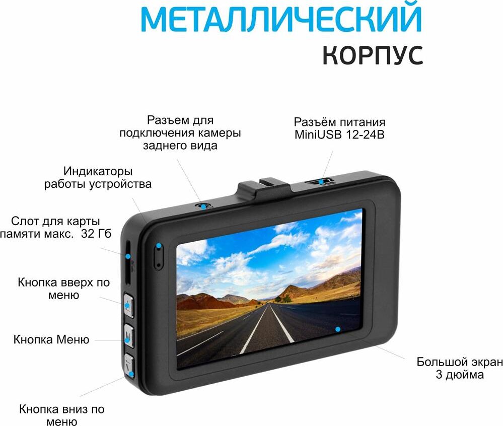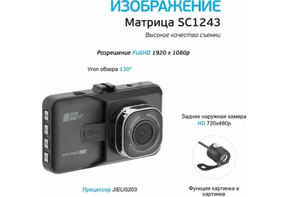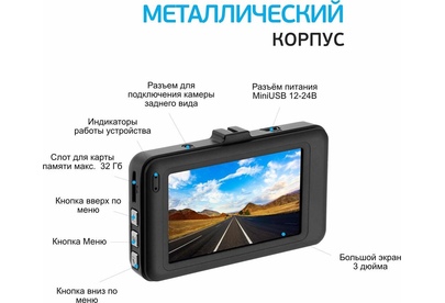 Двухканальное видео высокого качества. Видеозаписи в формате Full HD-видео (1920x1080) при 30 к/с. Прочный металлический корпус. Циклическая запись 2/3/5 мин. MicroHDSC карты (до 32 Гб). Фото до 12 Мп (4352 х 3264). Угол обзора 120 градусов. Дисплей 3.0.