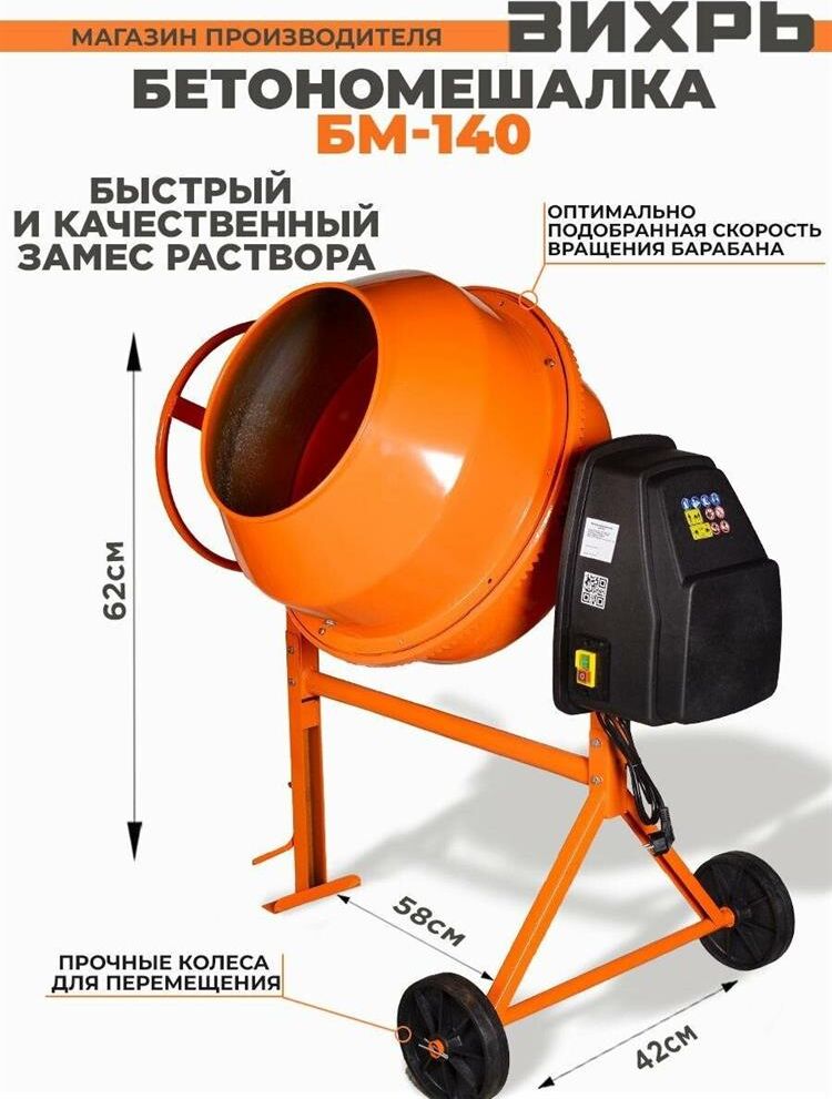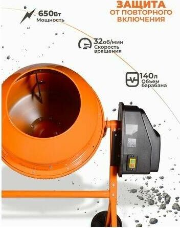 Мощность 650Вт, объем барабана 140л, вместимость барабана по загрузке 100л, диаметр отверстия барабана 375мм, скорость вращения барабана 29,5 об/мин, время приготовления порции смеси 3-7мин, венец чугунный, габариты 770х690х430 мм, вес 48кг.