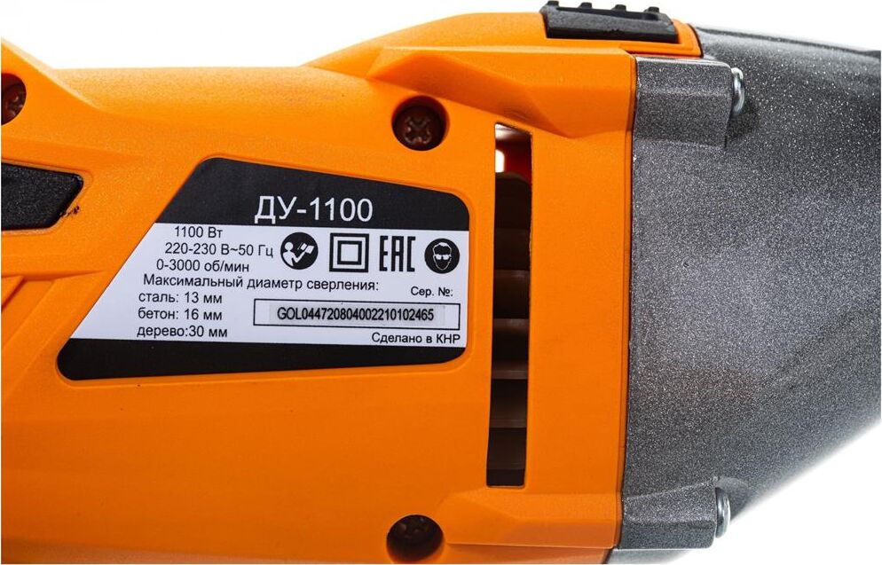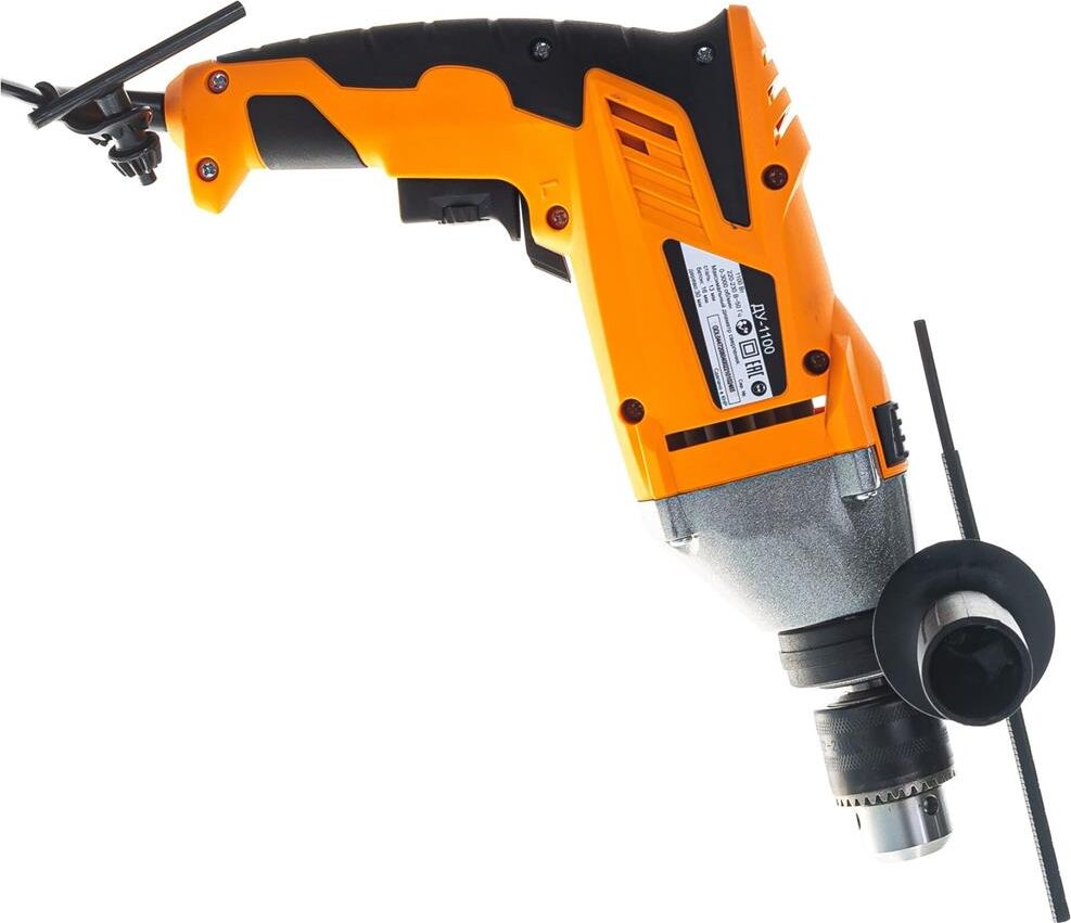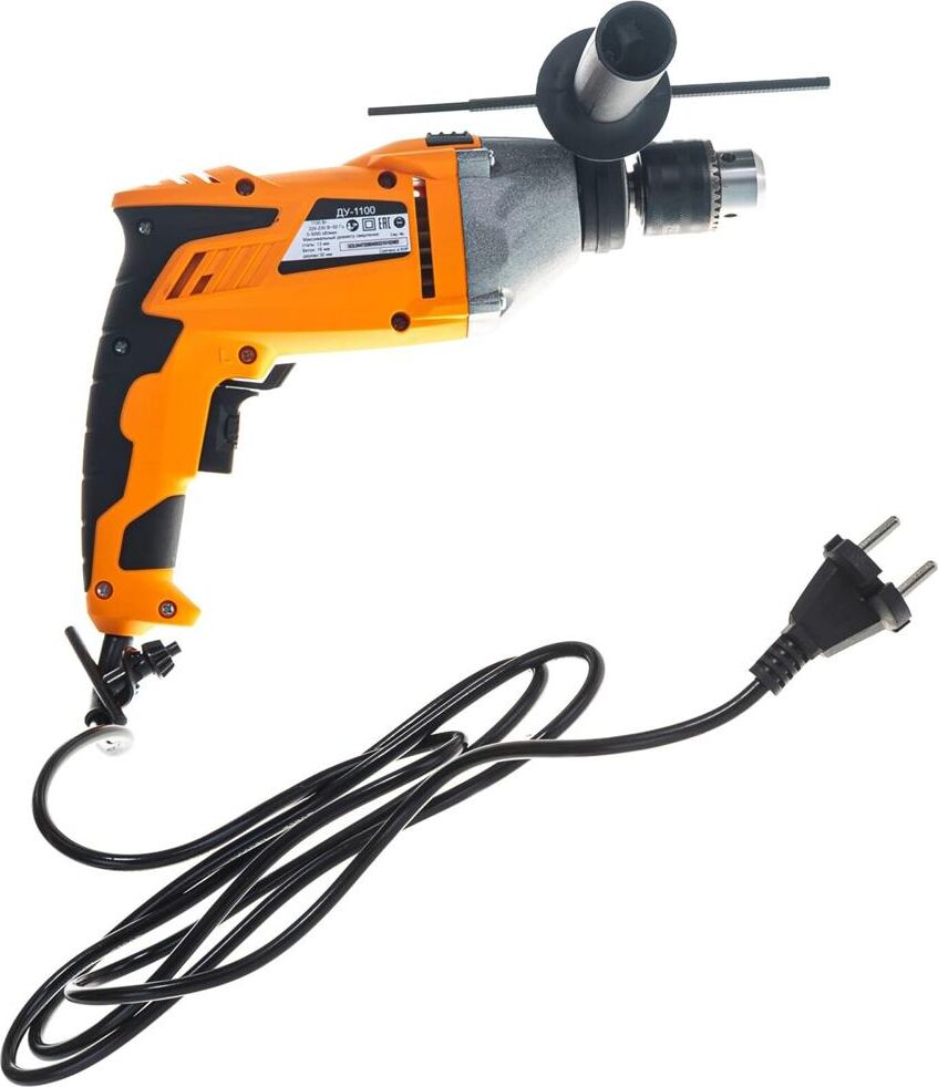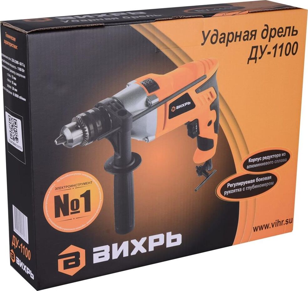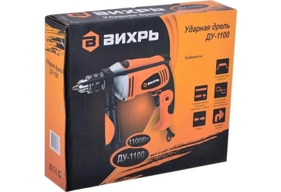 1100 Вт, число оборотов на холостом ходу 0-3000 об/мин, диаметр сверления сталь/дерево/бетон 10/25/13 мм, патрон ключевой 1,5-13 мм, вес - 2.3 кг.