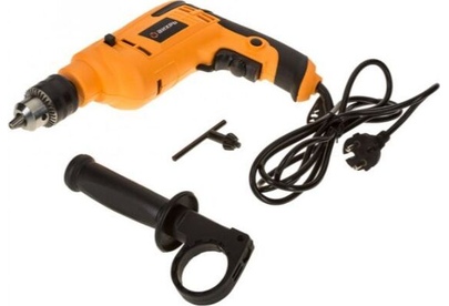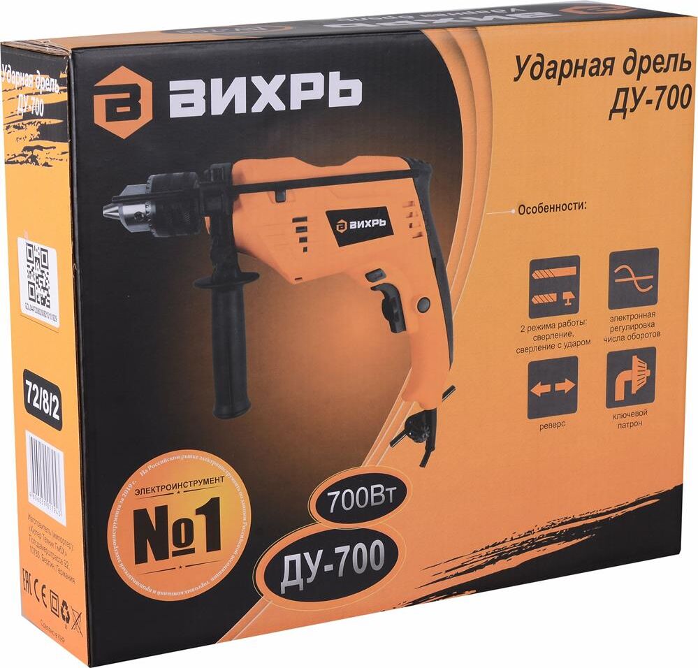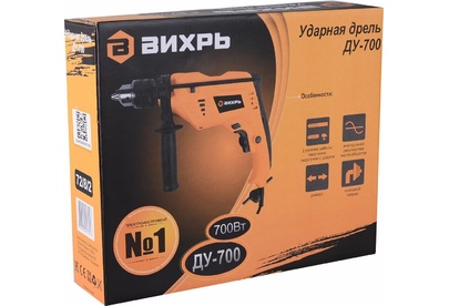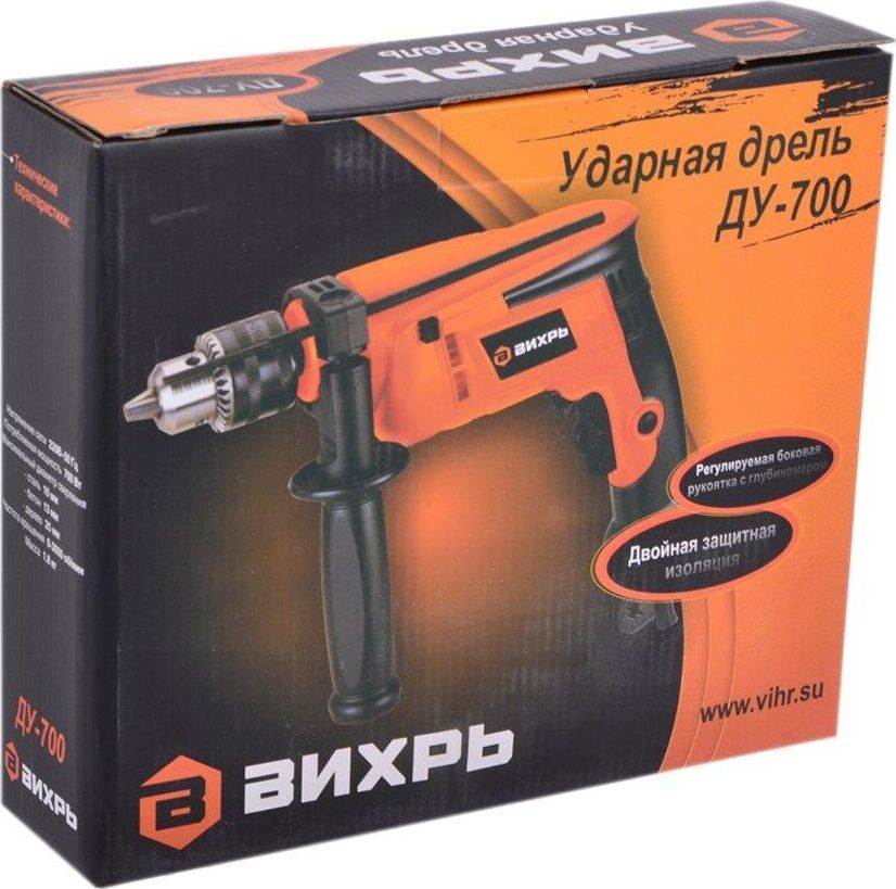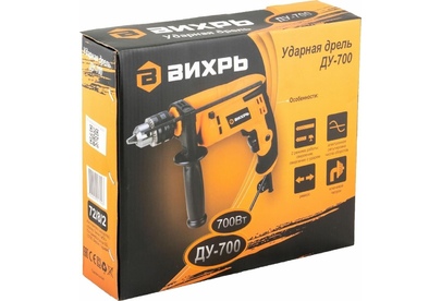 700 Вт, число оборотов на холостом ходу 0-3000 об/мин, диаметр сверления сталь/дерево/бетон 10/25/13 мм, патрон ключевой 1,5-13 мм, вес - 1,8 кг.