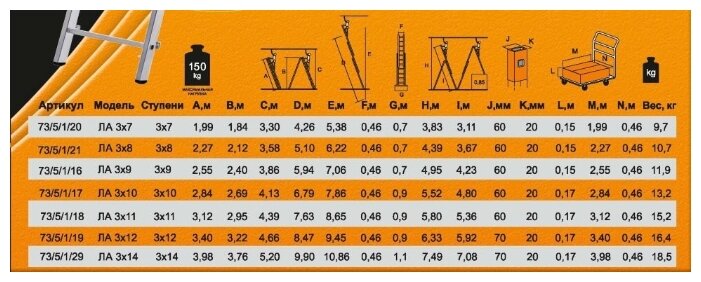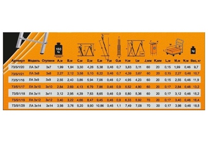 Лестница алюминиевая ВИХРЬ ЛА 3х14 Материал – алюминий; Количество ступеней – 14; Количество секций - 3; Максимальная нагрузка, кг – 150;