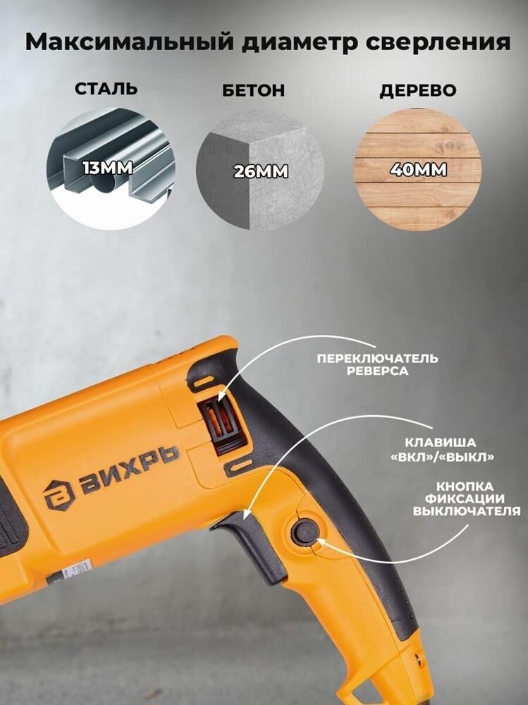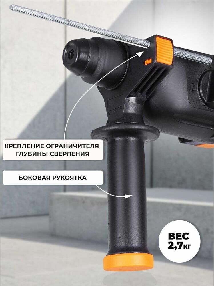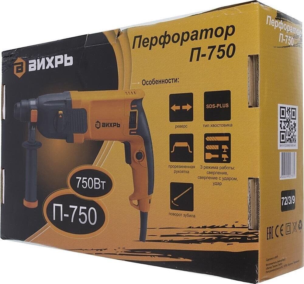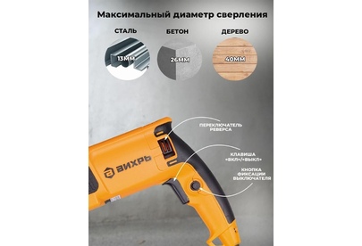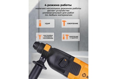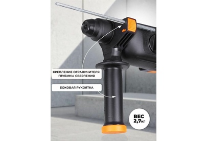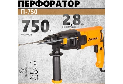 Мощность - 750Вт. Число ударов - 5200уд/мин. Сила удара - 2Дж. Макс. обороты - 1100об/мин. Количество скоростей - 1. Количество режимов - 3. Макс. диаметр бура - 40мм. Макс. диаметр сверления бетон/дерево/металл - 26/40/13мм. Тип патрона - SDS+. Возможности - наличие предохранительной муфты, режим долбления, регулировка числа оборотов.