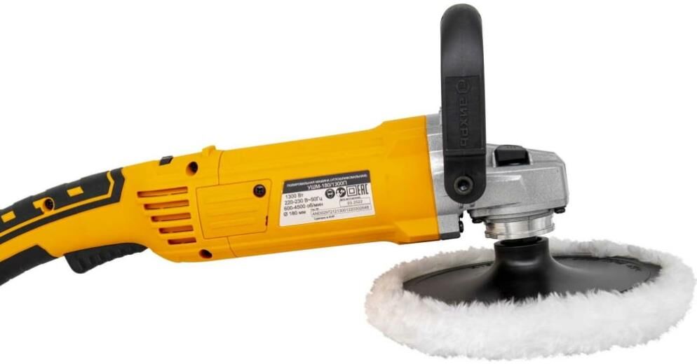 Полировальная машина (углошлифовальная) - ручной электроинструмент, предназначенный для выполнения полировальных и шлифовальных работ по металлу и другим материалам (кроме асбестосодержащих), без подачи воды, в производственных и бытовых условиях, с помощью полировального или шлифовального круга. Характеристики: Напряжение питающей сети, В: 220-230В, ~50 Гц Мощность, Вт: 1300 Диаметр шлифовального круга, мм: 180 Частота вращения, об/мин: 600-4500 Электронная регулировка оборотов Рукоятка: D-образная Вес: 2.89 кг