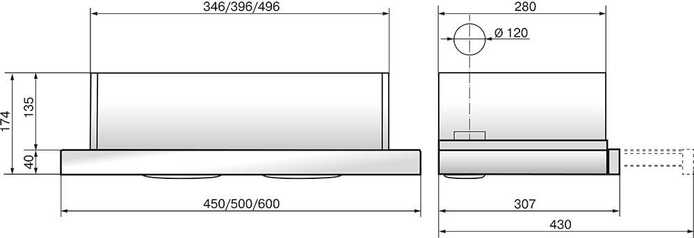 встраиваемая в шкаф, ширина встраивания: 50 см, режимы работы: отвод / циркуляция, производительность: 400 куб.м/ч, количество двигателей: 1