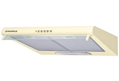 Maunfeld MP 350-1 (C) BEIGE — козырьковая вытяжка шириной 50 см. Крепится на стену над варочной панелью. Допускается установка под навесным шкафом, что позволяет значительно сэкономить пространство. Управление осуществляется при помощи кнопок. Рекомендована к использованию в кухнях площадью не более 12 м². Возможна эксплуатация на сменном угольном фильтре, без подключения к вентиляционному каналу. Ключевые преимущества: Три скорости вентилятора Стеклянный экран Низкий уровень шума