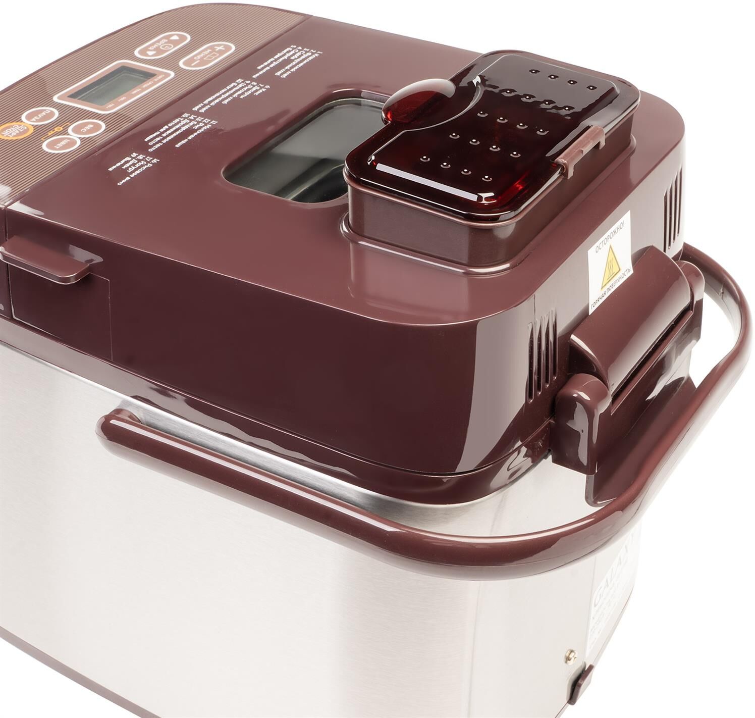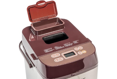 Номинальная потребляемая мощность 600 Вт Жидкокристаллический дисплей 19 программ приготовления Электронное управление Вес выпечки: 500 и 750 г 3 степени поджаривания корочки Отложенный старт до 15 часов Подогрев хлеба в течение 60 минут после приготовления Сохранение установленной программы при кратковременном отключении электричества Автоматический диспенсер для добавления ингредиентов Антипригарное покрытие контейнера для выпечки и лопасти для замешивания Ручка для переноски Прорезиненные ножки, препятствующие скольжению Большое смотровое окно Защита от перегрева Блокировка от детей Номинальное напряжение 220-240 В ~ Номинальная частота 50 Гц