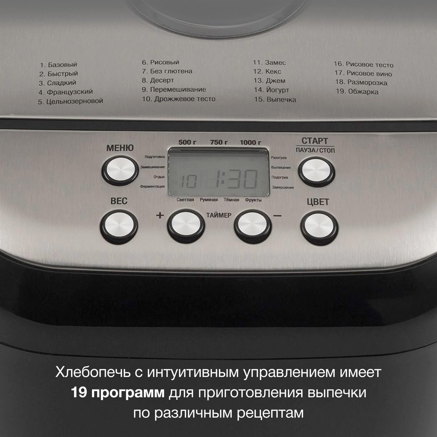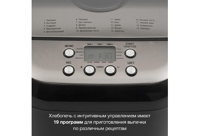 Мощность 600 Вт Максимальный вес выпечки 1000 г Количество размеров выпечки 500/750/1000 Регулировка веса выпечки Программ приготовления 19 Замес теста Выбор цвета корочки Таймер отсрочки старта 15 ч Поддержание температуры Окно контроля процесса Запоминания программы (при отключении питания) Антипригарное покрытие формы Программ для теста 3 Материал корпуса пластик Цвет черный Дополнительный цвет серебристый Гарантия 24 мес. Страна производитель Китай