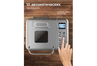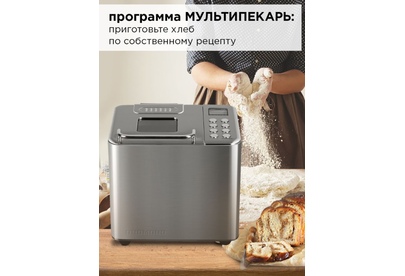 программы - классический хлеб, французский хлеб, цельнозерновой хлеб, экспресс, сдоба, безглютеновый хлеб, кекс, варенье и джем, бисквит, тушение, йогурт, ржаной хлеб, мультипекарь, молочная каша, расстойка и выпечка, варка, суп, замес с изменением в
