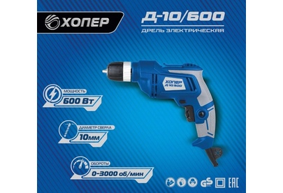 Рег.оборотов 0-3000об/мин, 600Вт, мах ф сверла 10мм, коробка