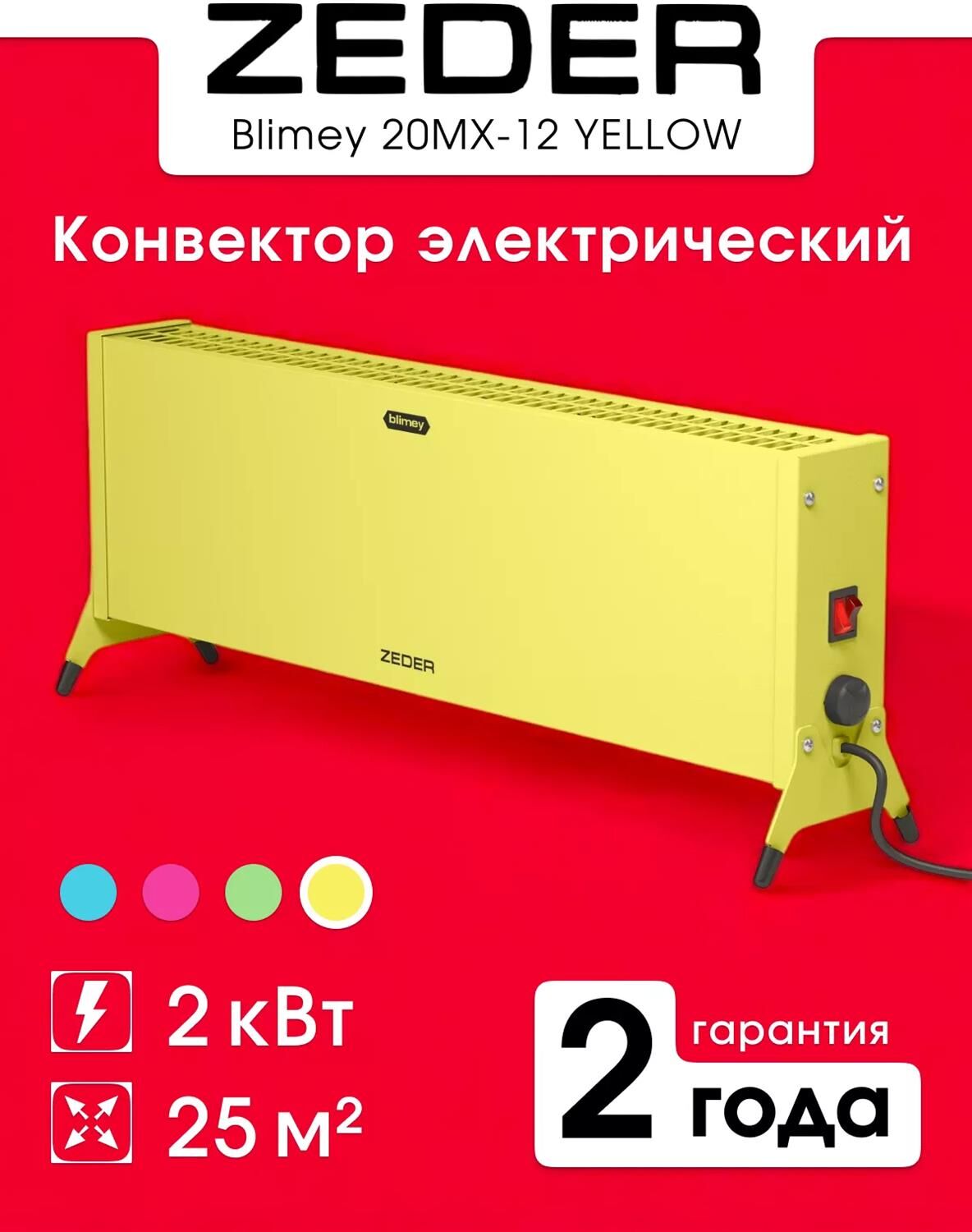 Электрический конвектор Zeder Blimey модель 20MX-12 — это уникальный обогреватель из серии Blimey от популярного бренда ZEDER, который объединяет механическое управление с ярким и привлекательным дизайном. Этот конвектор станет отличным выбором для создания уютной атмосферы в вашем доме или офисе. Модель 20MX-12 доступна в четырех ярких цветовых вариантах: голубом, зеленом, желтом и розовом. Такое разнообразие позволяет легко подобрать конвектор, который гармонично впишется в любой интерьер, добавляя яркий акцент и радость в ваш дом. Он особенно подойдет для детских комнат и других помещений, где требуется не только обогрев, но и стильный и привлекательный дизайн. С мощностью 2,0 кВт конвектор 20MX-12 обеспечивает эффективный обогрев площади до 25 квадратных метров, позволяя вам наслаждаться комфортной температурой в любое время года. Степень защиты IP20 гарантирует безопасность использования в помещениях с нормальной влажностью. Конвектор оснащен опорами для удобной напольной установки и кронштейнами для нас