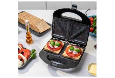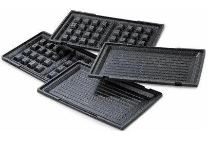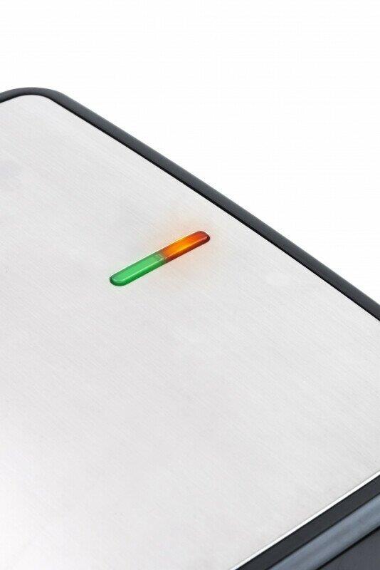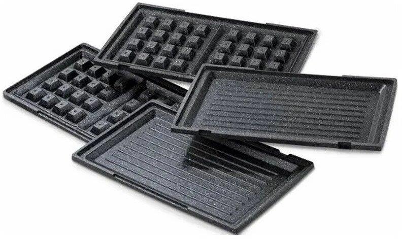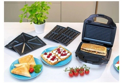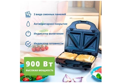 Мощность 900 Вт; антипригарное покрытие на 4 сендвича; возможность работы в вертикальном состоянии; 3 набора съёмных пластинЖ для сэндвичей, для вафлей, для гриля