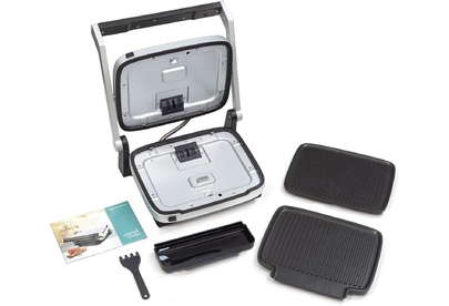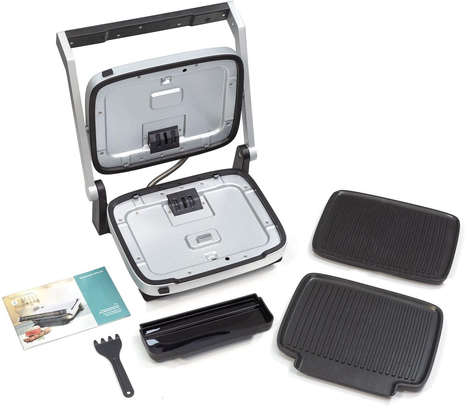Контактный гриль Мощность: 2000 Вт Напряжение: 220-240В, 50/60Гц Сенсорная панель управления на ручке 7 автоматических программ 4 степени прожарки стейка 2 съемные жарочные панели 30х25см Антипригарное покрытие панелей Съёмный поддон для сбора жира Авторегулировка высоты верхней панели Материал корпуса: металл