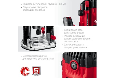 Мощность, Вт 1650. Число оборотов, об/мин 6000-26000. Рабочий ход фрезы, мм 50. Размер цанги, мм 6/8. Макс диаметр фрезы, мм 74. Регулировка оборотов есть. Точная подстройка глубины фрезерования есть. Копирование (по шаблону, по радиусу, фигурное) есть. Патрубок пылеотвода есть. Диаметр патрубка (внут./наруж.), мм 35 / 39. Плавный пуск есть. Поддержание постоянных оборотов под нагрузкой нет. Наличие подсветки нет. Длина кабеля, м 3. Напряжение, В/Гц 230 / 50. Габариты, см 30x18x31. Масса изделия, кг 4.