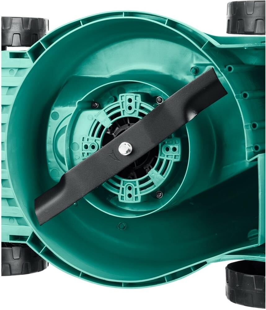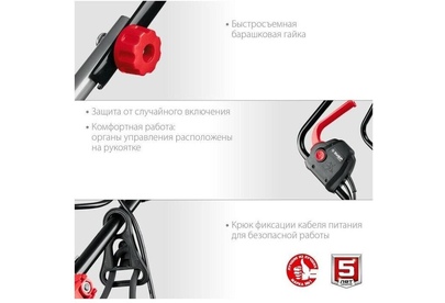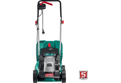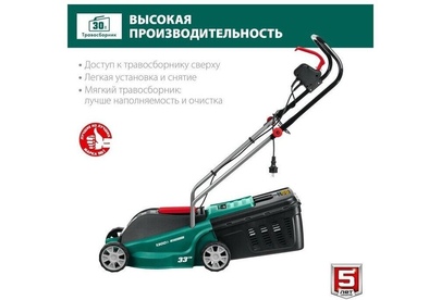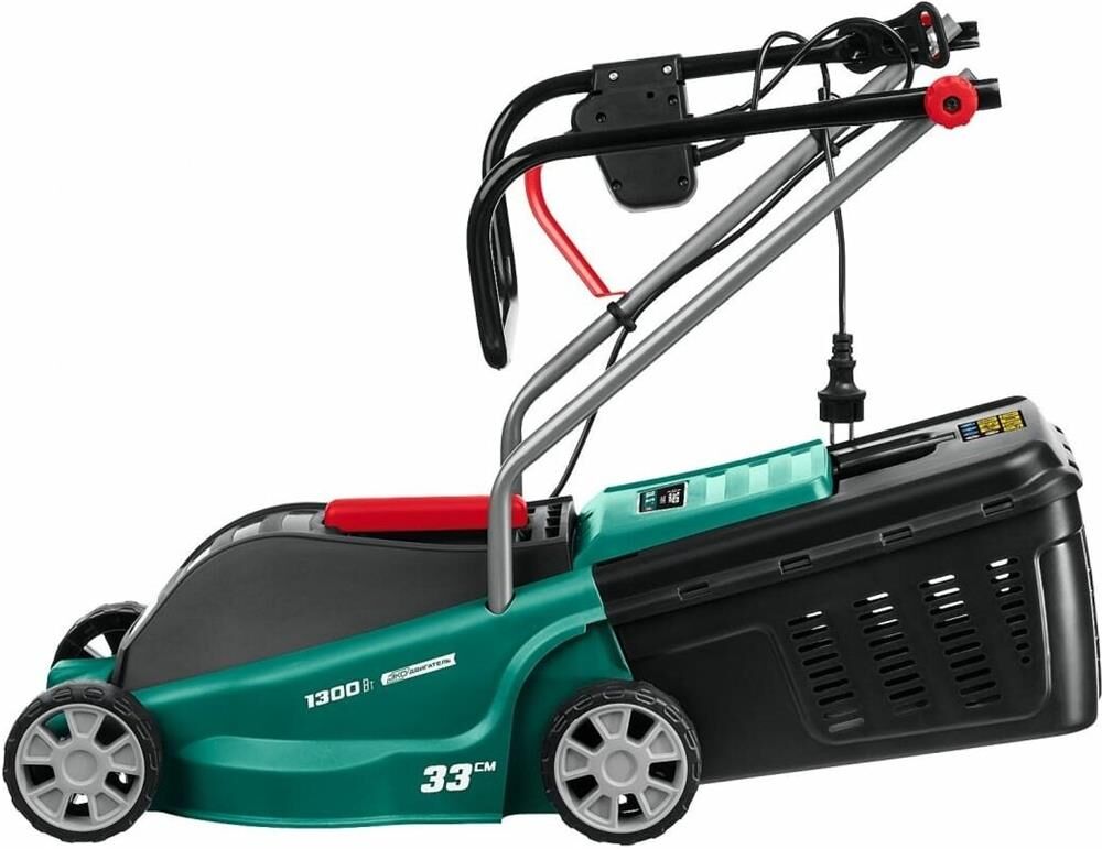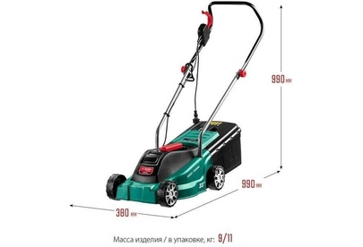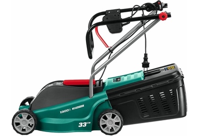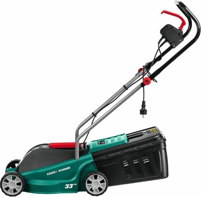 Тип двигателя: электрический. Мощность двигателя: 1300. Режущая система: нож. Ширина скашивания: 33. Система регулировки высоты скашивания: 3 уровня, осевая. Тип выброса травы: задний выброс. Тип травосборника: жесткий. Объем травосборника: 35. Количество колес: четырехколесная. Материал колес: пластик. Тип электропитания: от электросети. Вес товара: 9. Комплект поставки: Газонокосилка, травосборник, рукоятка верхняя, рукоятка нижняя, комплект крепежа, руководство по эксплуатации.. Особенности: Удобное средство для кошения газона на небольшом участке. Прекрасная альтернатива бензиновой газонокосилке: меньшее потребление энергии при той же режущей способности, отсутствие необходимости постоянной покупки ГСМ и контроля уровня топлива и масла, простота эксплуатации и ремонта.. Тип передвижения: несамоходное. Класс защиты: II. Класс защиты корпуса: IPX4. Габариты упаковки (ед) ДхШхВ: 0.571x0.4x0.31. Вес упаковки (ед): 16.33. Гарантия: 24 мес.. Высота скашивания: 20 - 60 мм. Размеры: 56 х 31 х 40 см. Особенности у