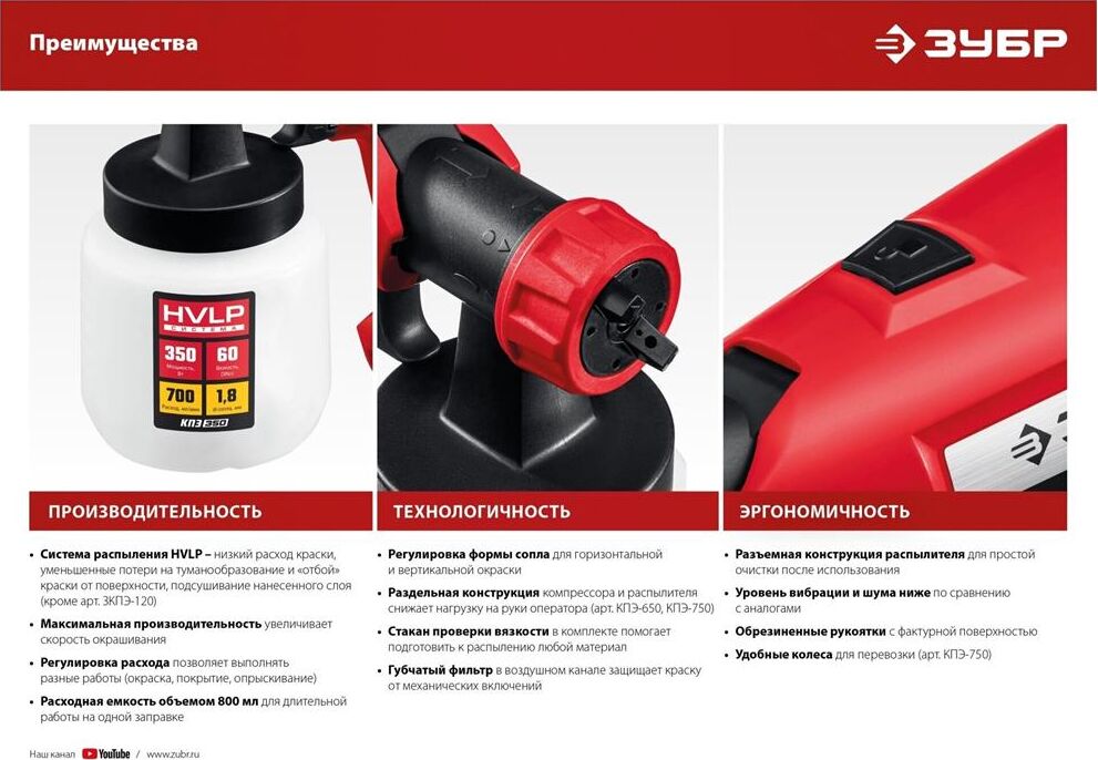 Электрический краскопульт Зубр МАСТЕР КПЭ-650 предназначен для нанесения красок, лаков и иных растворимых материалов аналогичной вязкости на различные поверхности. Форма сопла регулируется, что позволяет проводить горизонтальную/вертикальную покраску, а также работать в труднодоступных местах. Технические характеристики Зубр МАСТЕР КПЭ-650 Принцип работы воздушный Способ распыления ЛКМ HVLP Вес, кг 3 Производительность, л/мин 0,7 Емкость бака, л 0,8 Диаметр сопла, мм 1,8 Max вязкость, DIN 60 Мощность, Вт 650