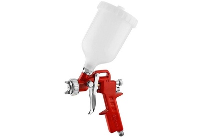 Комплектация: Краскопульт. Бачок. Переходник. Инструмент для обслуживания краскопульта.. Особенности: Система распыления High Pressure (HP): высокое входное давление и низкий расход воздуха позволяет использовать краскопульт с бытовыми компрессорами. Получается однородный факел идеальной формы. Регулировки формы факела и хода курка делает.. Вес нетто: 0.58. Расход воздуха: 225. Сопло: 1.3. Объем бака: 0.6. Материал бака: пластик. Посадочный размер (для коннектора): 1/4. Расположение бака: верхнее. Технология распыления: HP. Коннектор: рапид. Габариты упаковки (ед) ДхШхВ: 0.13x0.13x0.23. Вес упаковки (ед): 0.6. Гарантия: 6 мес.. Давление: 3 - 5 Бар. Расход воздуха: 225 л/мин. Вес нетто: 0.58 кг. Объем бака: 0.6 л. Давление: 3 - 5 Бар. Сопло: 1.3 мм