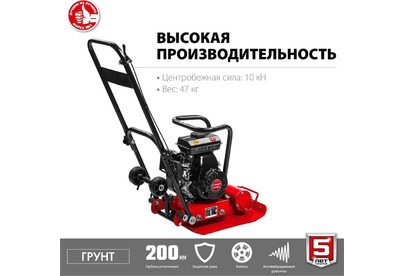 Бак для воды: нет. Вид топлива: бензин Аи92. Длина плиты, мм: 480. Мощность, л.с.: 2. Реверс: нет. Центробежная сила, кН: 10. Ширина плиты, мм: 320. Мощность, Вт: 1500. Тактность двигателя: 4-х. Тип двигателя: бензиновый. Глубина уплотнения, мм: 200 .Габариты плиты, мм: 480х320. Вес, кг: 47.